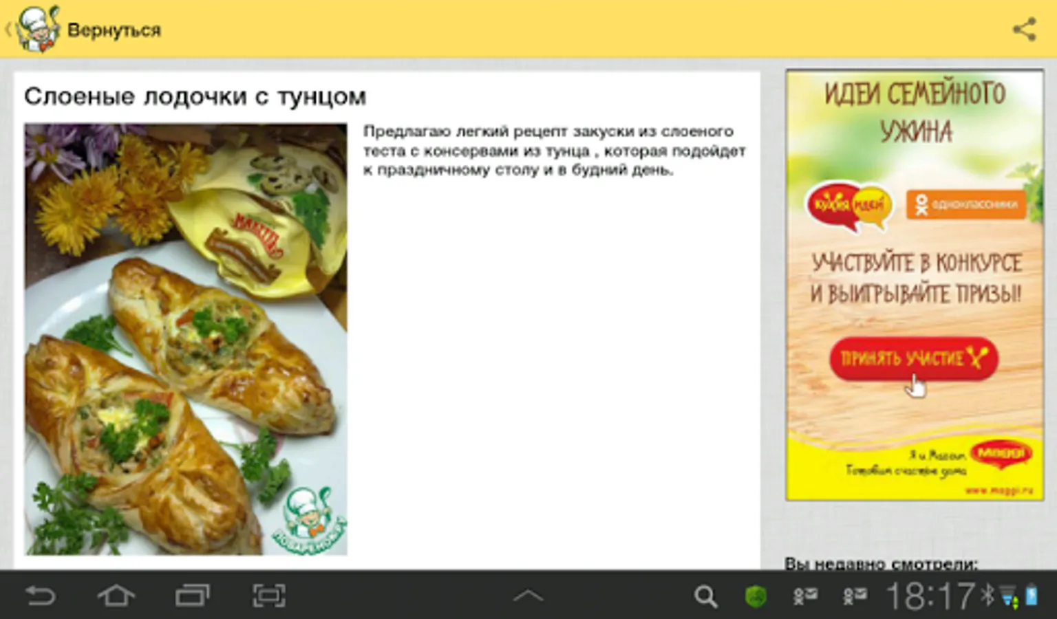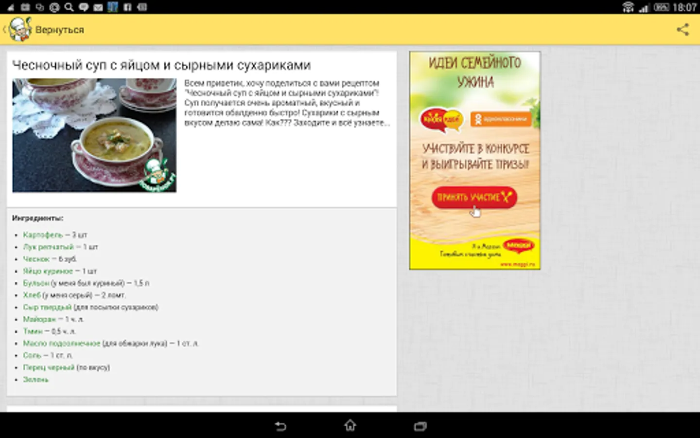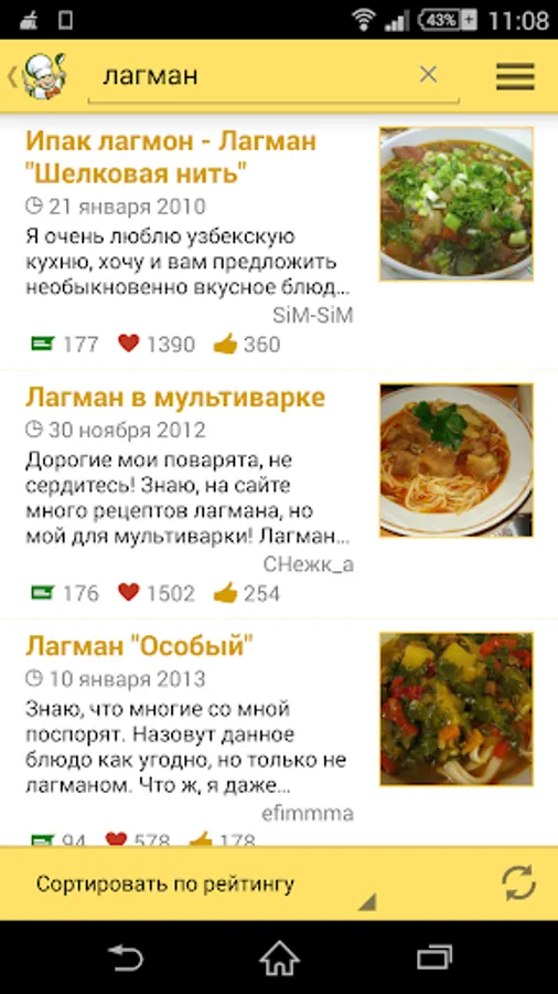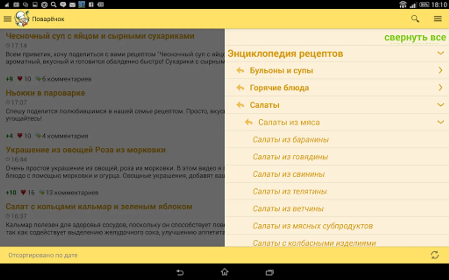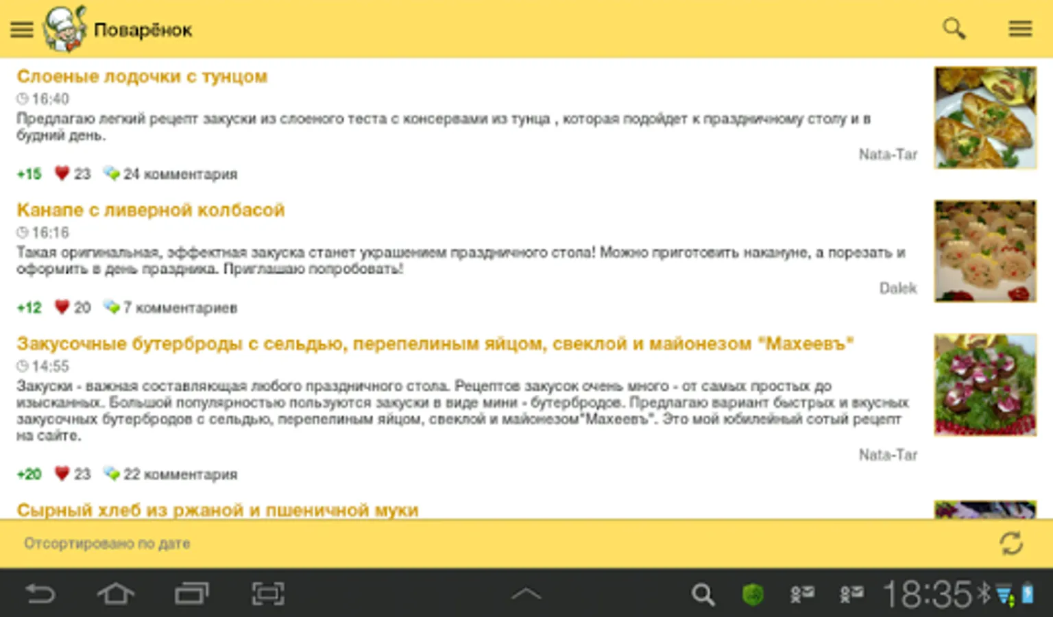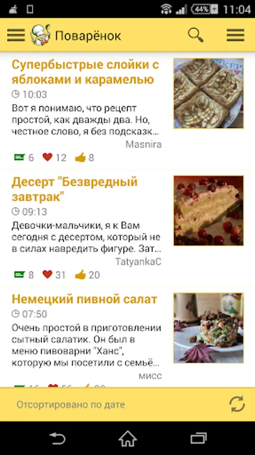 The new app provides access to culinary recipes of website Povarenok.ru (the word means “young cook”), which have been added of the site users for many years. You see objective assessments and remarks of the visitors, that’s why you can choose only well-tried recipes.