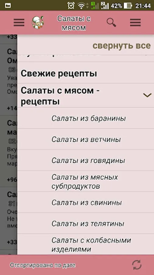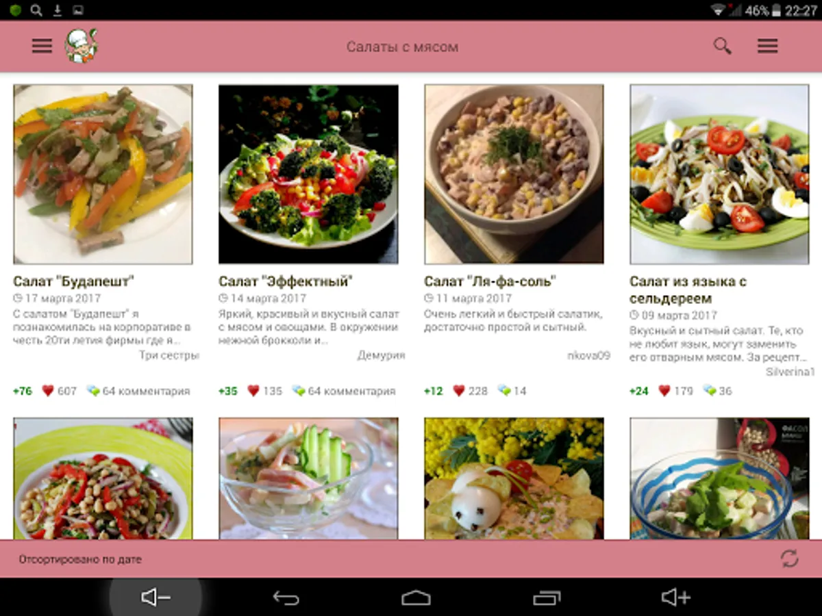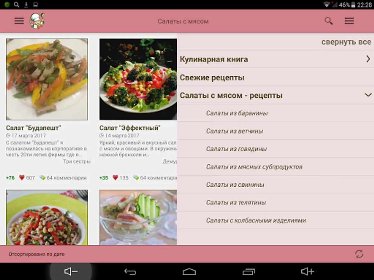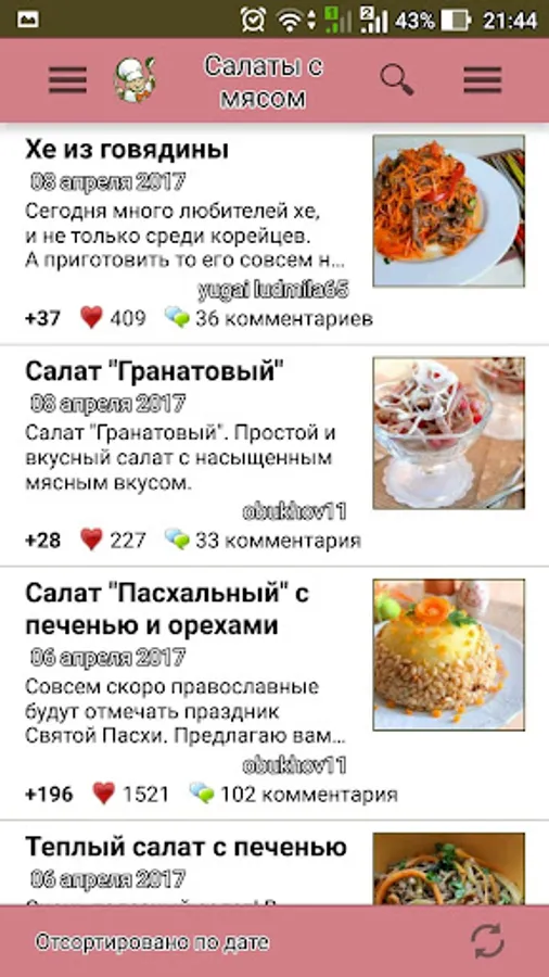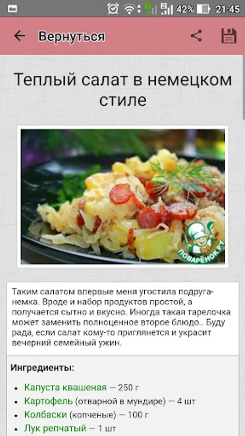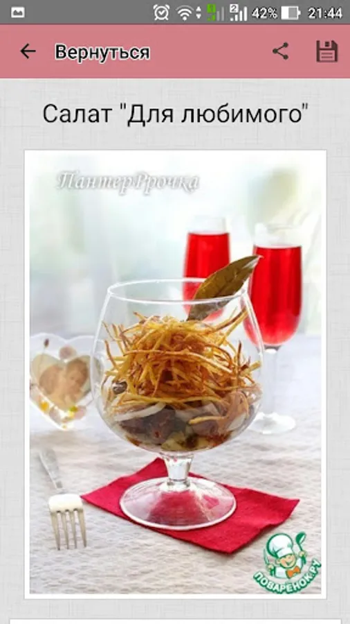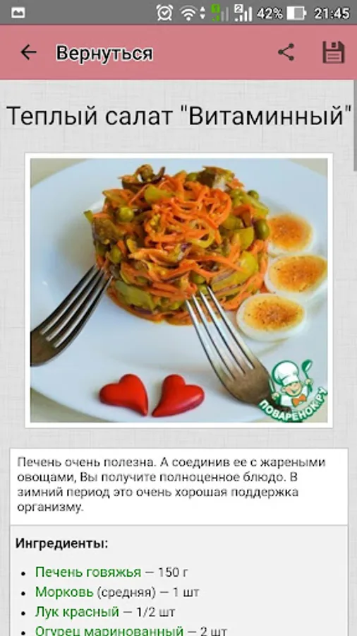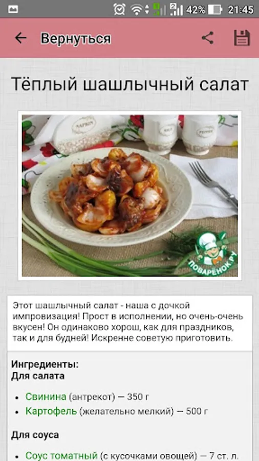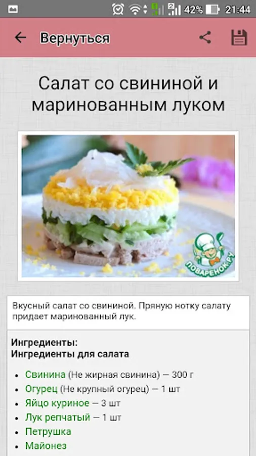 Cook wonderful meat salads with Povarёnok.ru application, and let all admire your culinary talents! And not to waste time looking for favorite recipes, add them to a personal cookbook!
