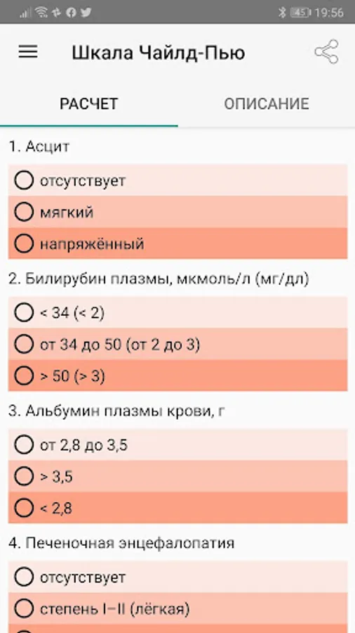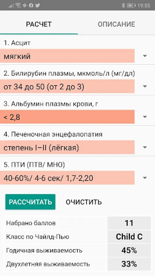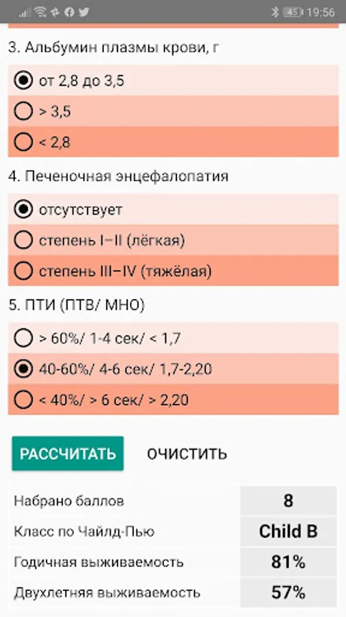 According to the Child-Pugh classification, the severity of cirrhosis is estimated by the sum of the points scored by the value of several parameters.