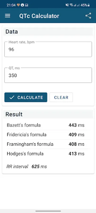 The QTc calculator is based on heart rate (pulse rate) in beats per minute and QT interval, either in seconds or miliseconds.