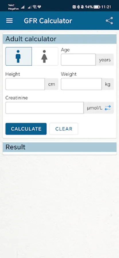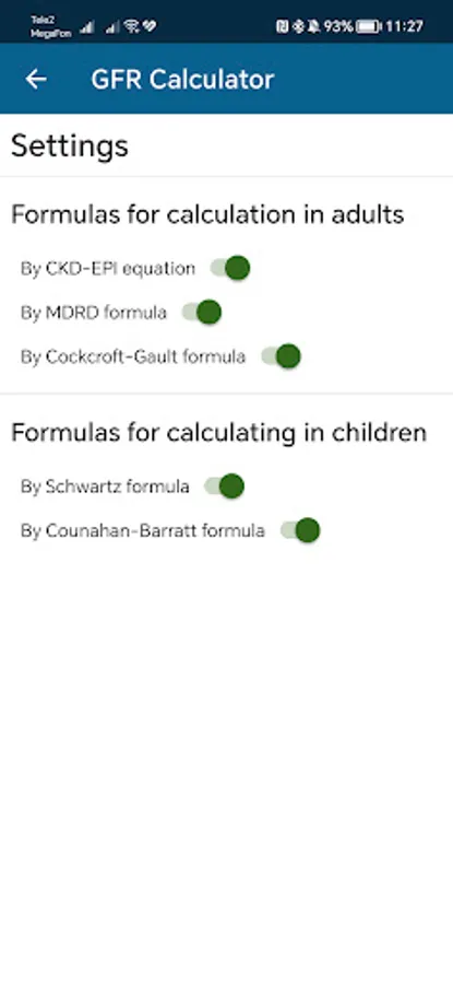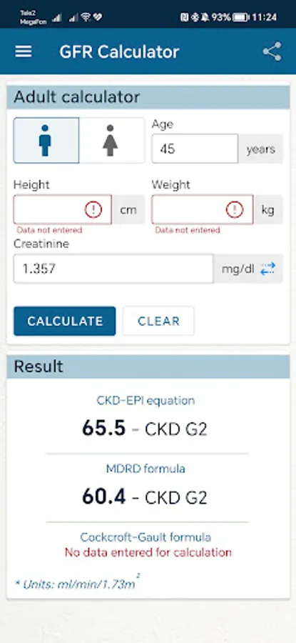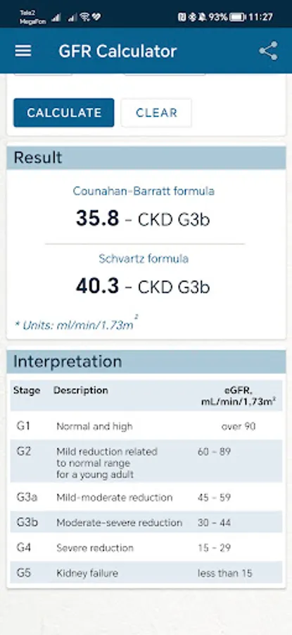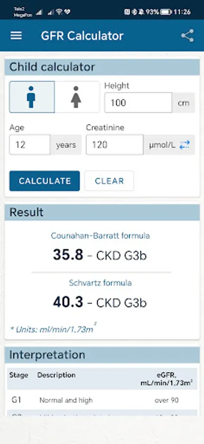 The presented calculator calculates using the Cockroft-Gault formulas, MDRD and the CKD-EPI equation. GFR in children is calculated according to the formula of Schwartz and Counahan-Barratt.