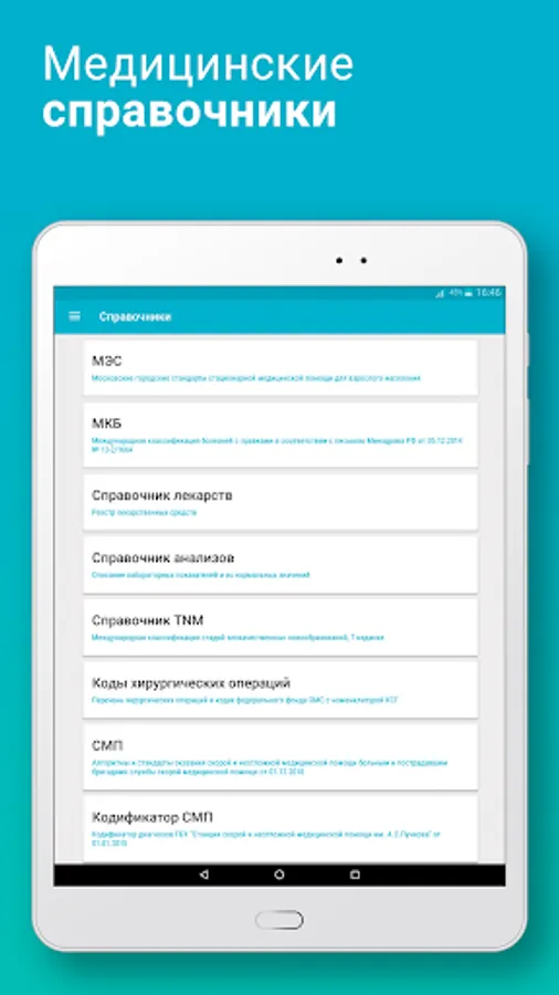 Doctor's reference book: standards for the treatment of diseases and first aid, medical calculator, drugs and their analogues, ICD-10, laboratory diagnostics (analyzes). Plus medical news, the latest PubMed publications and FEMB (medical literature) - all in one app, free and without ads!