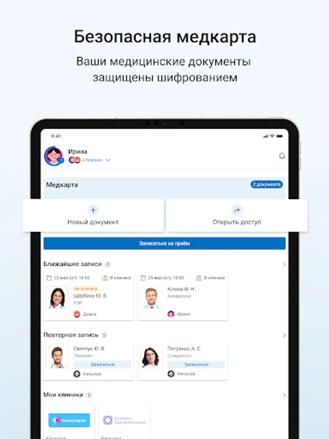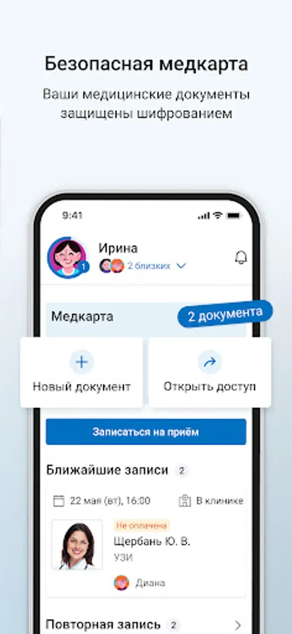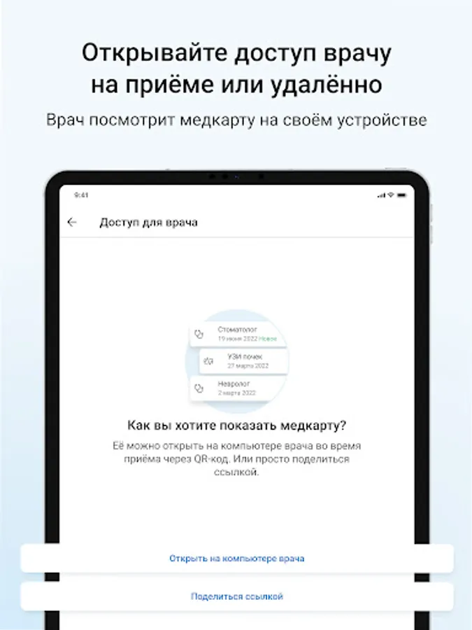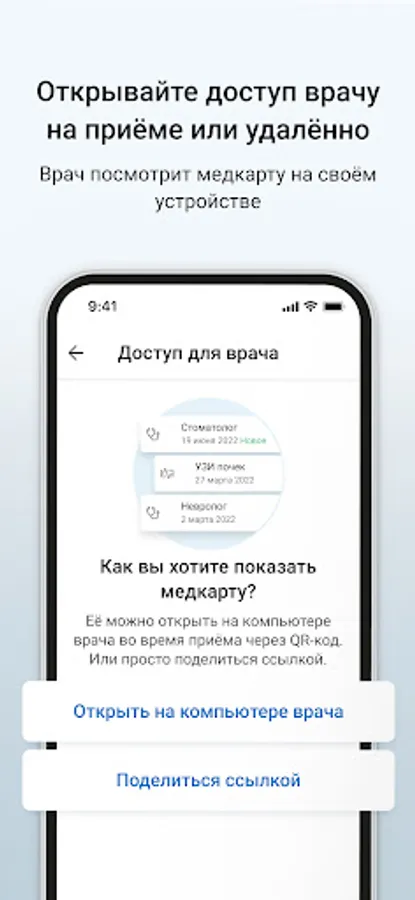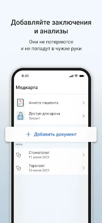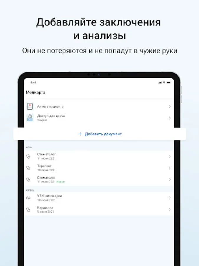 You no longer need to carry a lot of papers with you or waste your phone memory on photos and document scans. Upload conclusions, appointments, results of analyzes and examinations to the MedPoint electronic medical record. Any doctor will be able to see them if you give the doctor temporary access to the medical record.