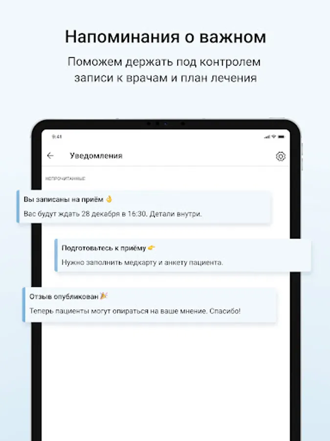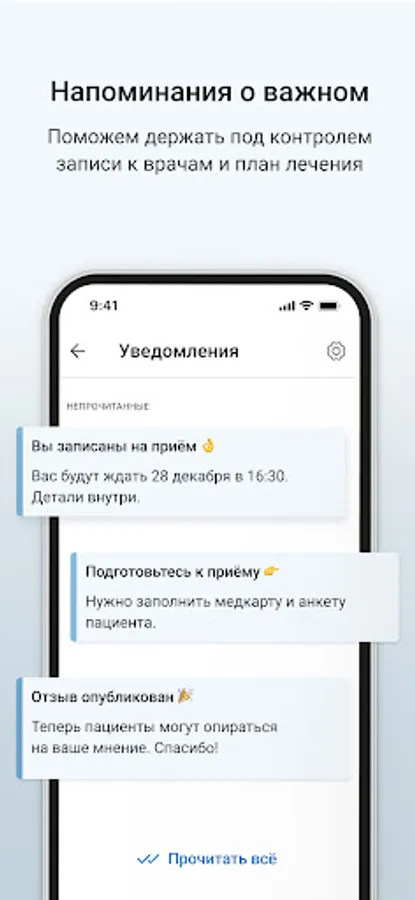 The MedPoint application is connected to the ProDoctors website and partner clinics. Therefore, if you signed up for a specialist through the website or clinic, information about the appointment will appear in your personal MedPoint account. And the app will send a notification on the eve of the appointment.