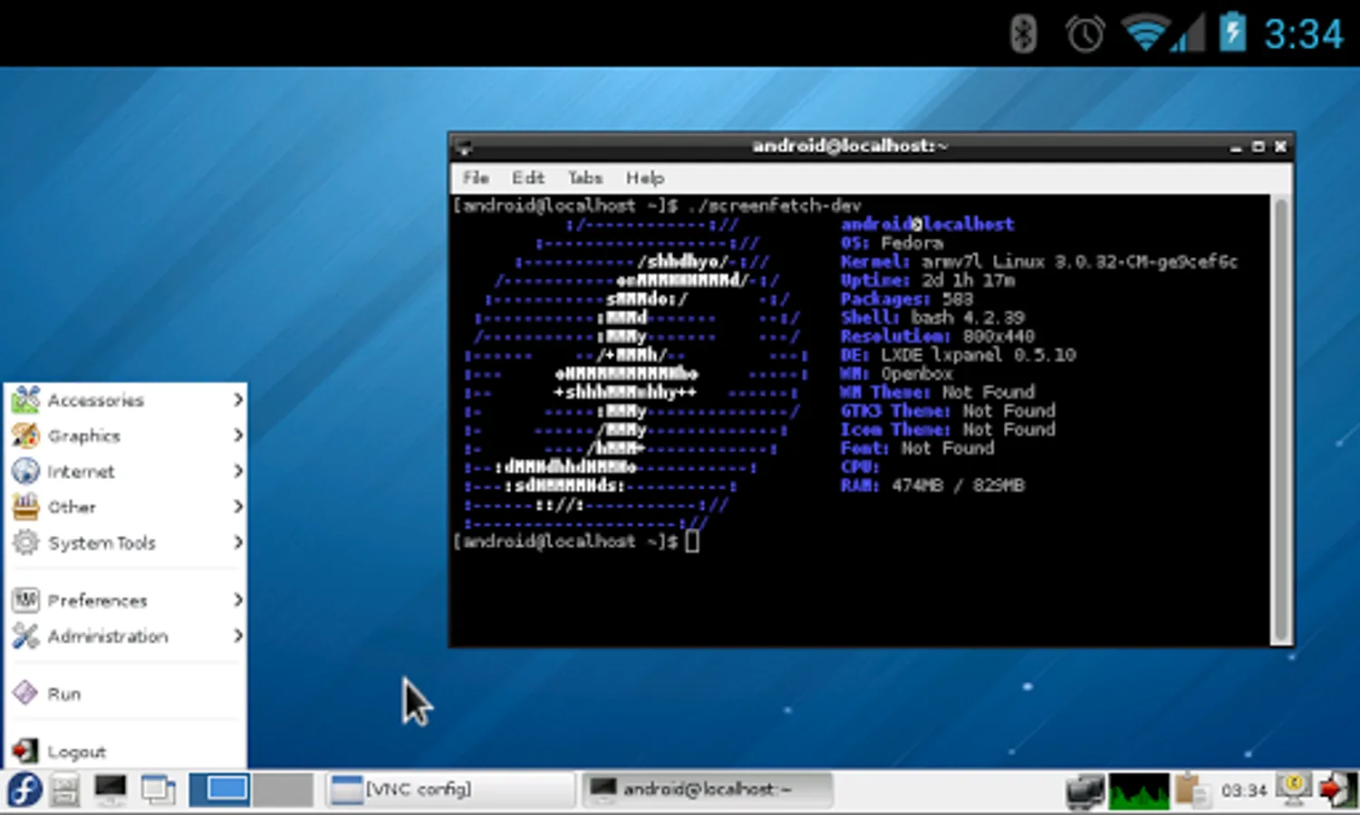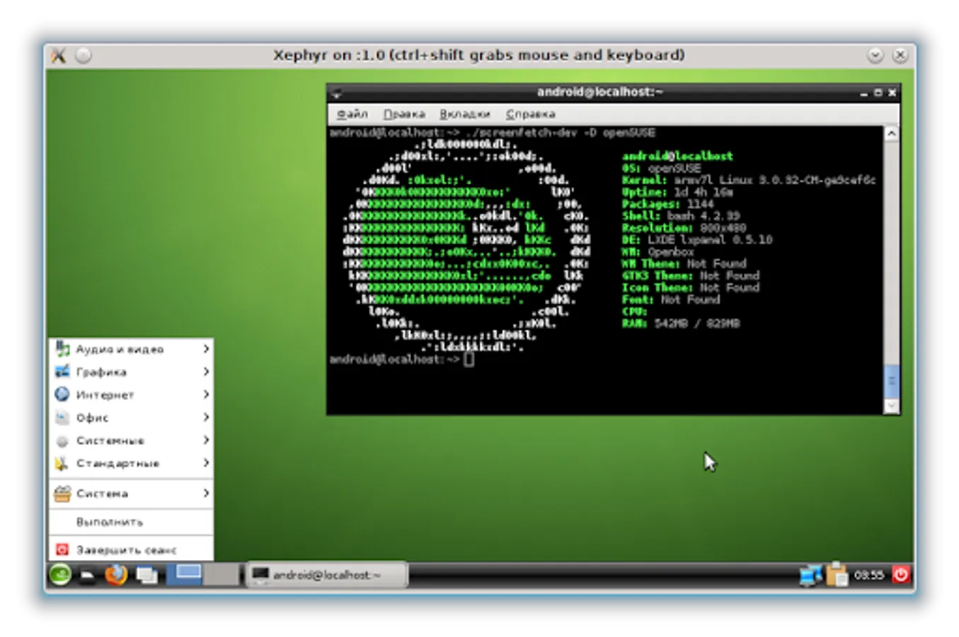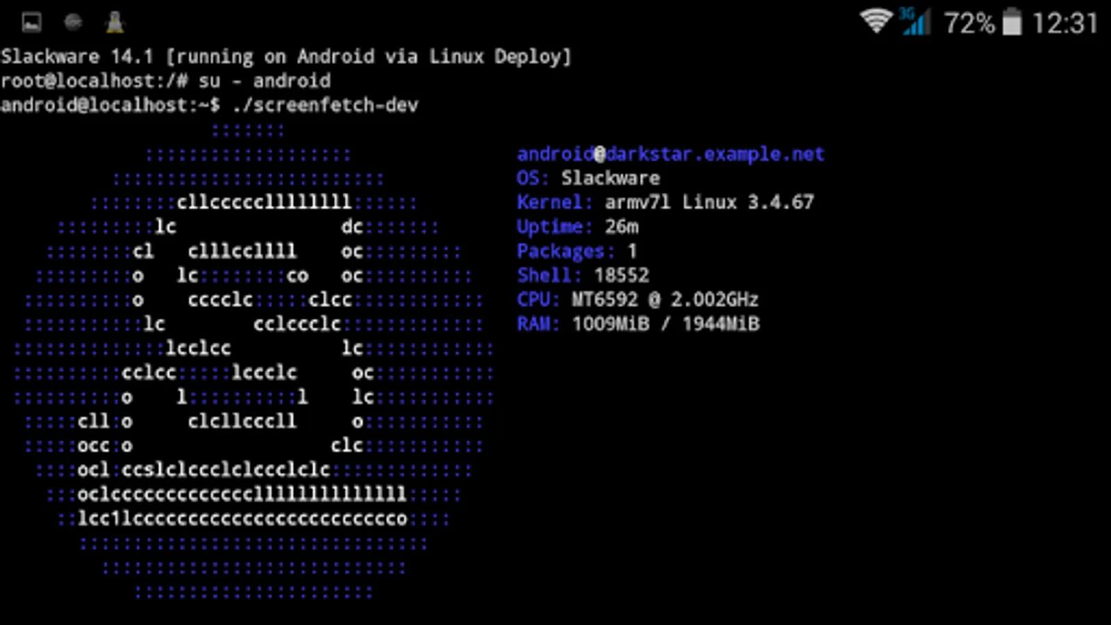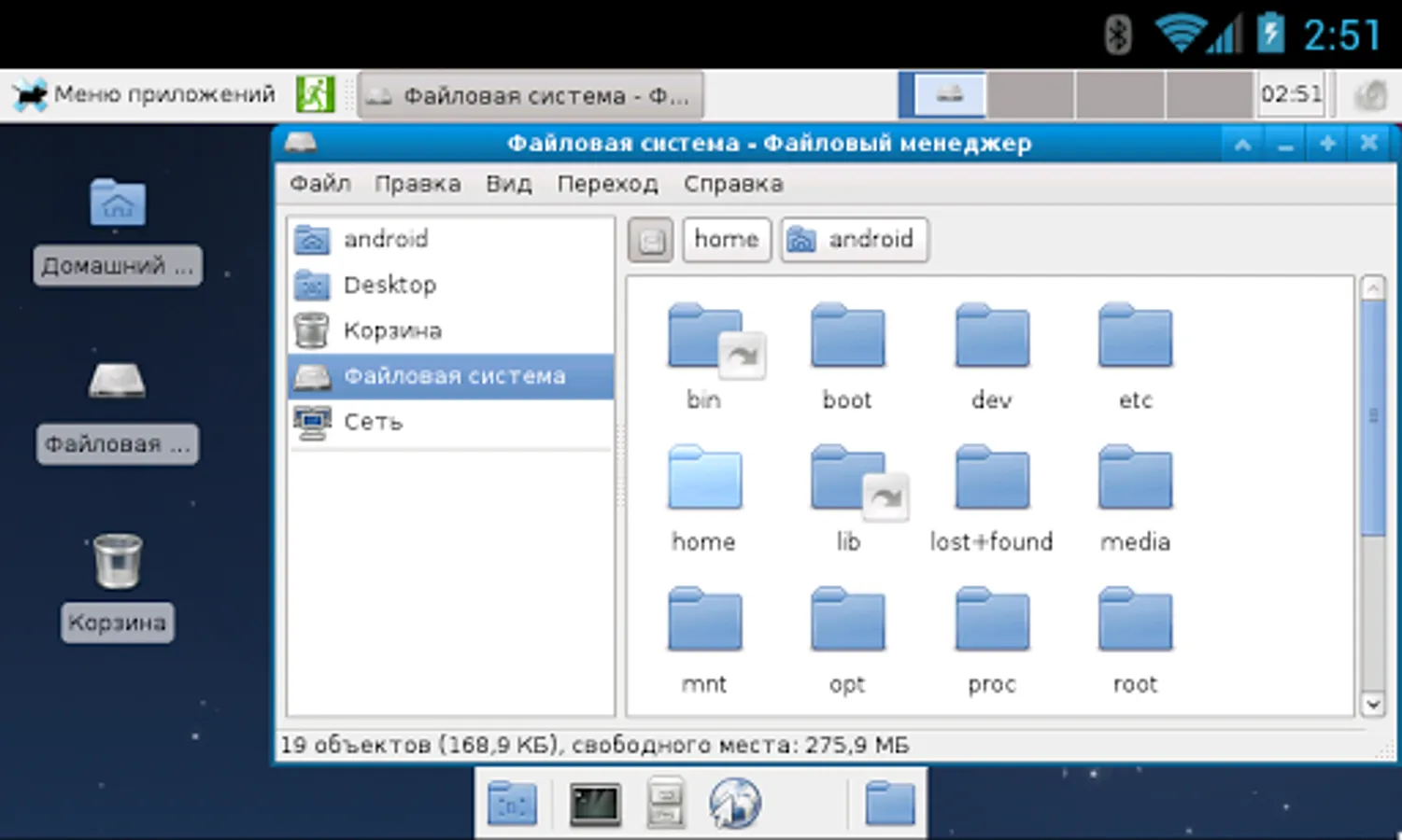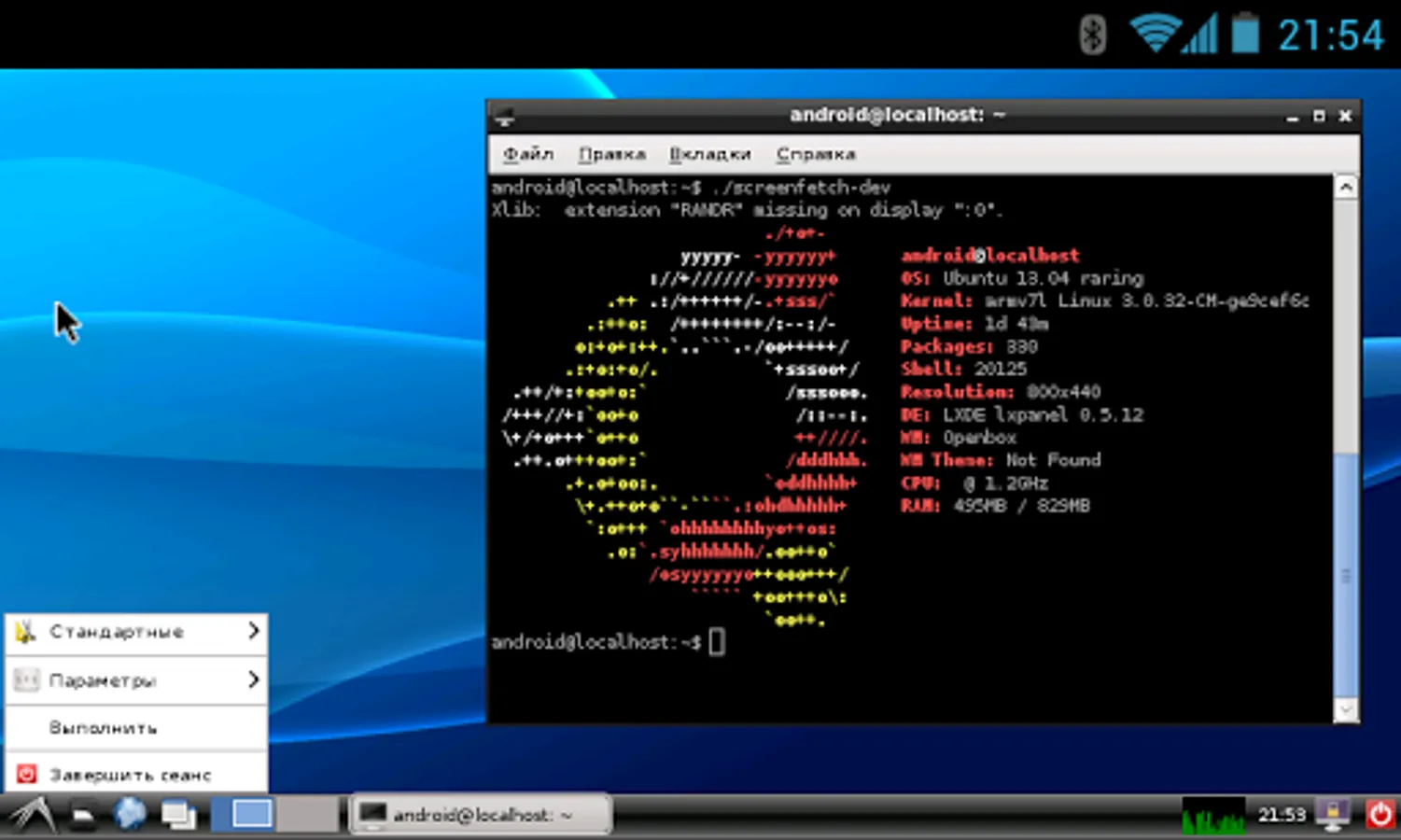The application creates a disk image on a flash card, mounts it and installs an OS distribution. Applications of the new system are run in a chroot environment and working together with the Android platform. All changes made on the device are reversible, i.e. the application and components can be removed completely. Installation of a distribution is done by downloading files from official mirrors online over the internet. The application requires superuser rights (ROOT).