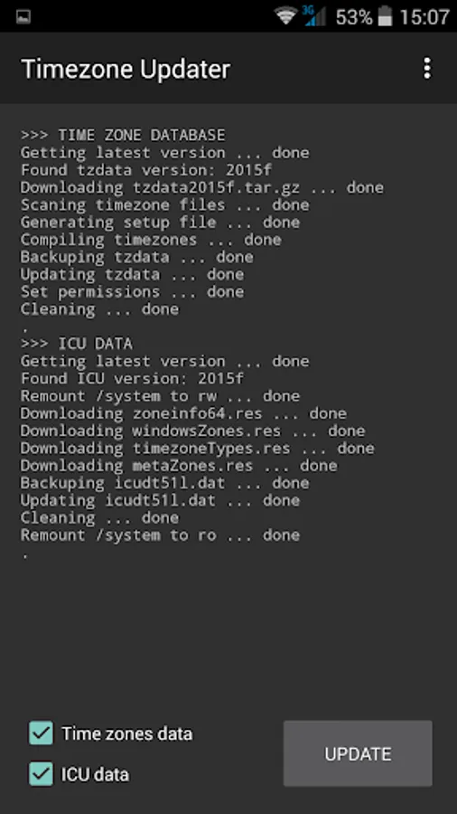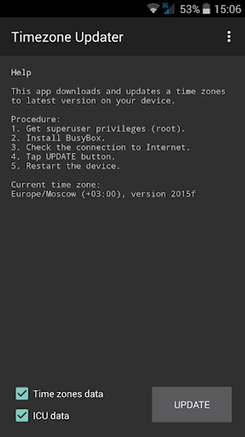 This app downloads and updates time zones to the latest version on your device. This update should fix all known problems with time zones, such as incorrect time in Android and some applications.