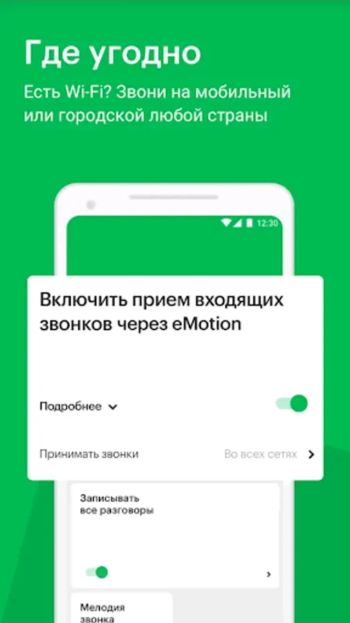 In eMotion, you can configure how to receive calls - on any networks or only Wi-Fi, you can also select specific Wi-Fi networks, for example, only at home and at work.