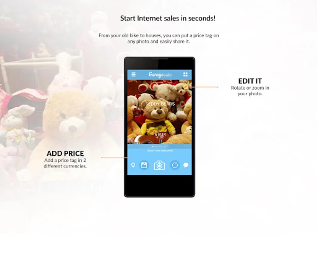 ✔ Easy to start online garage sales. The only thing you have to decide is what you want to sell. Then GarageSale helps you snap a photo of it, add a desired price in two different currencies and share it online with your followers.