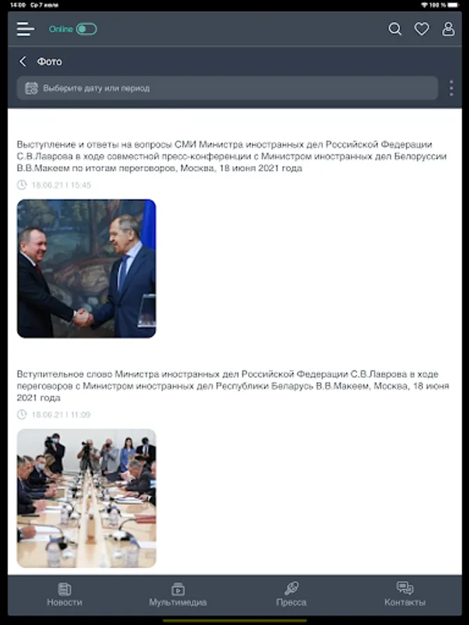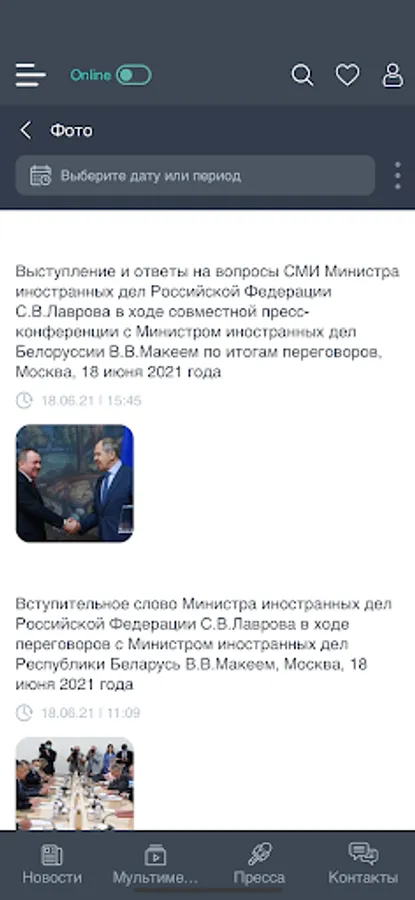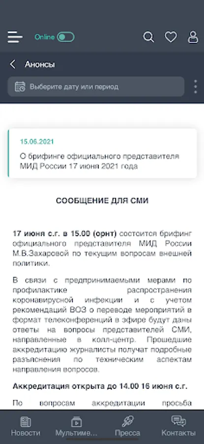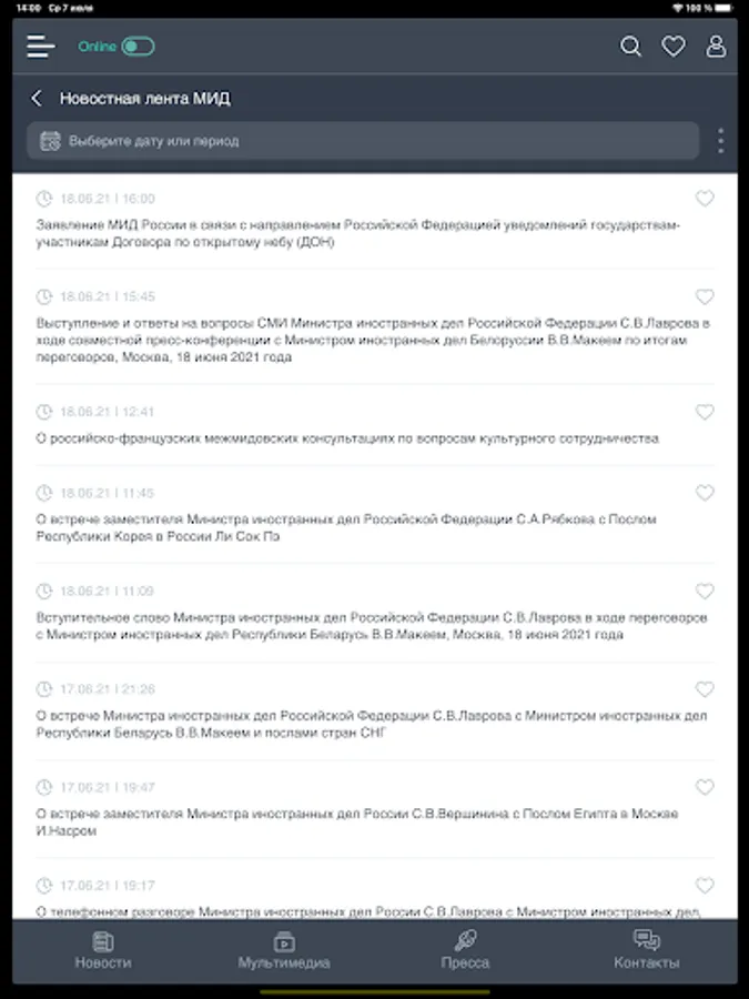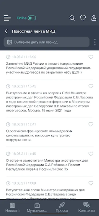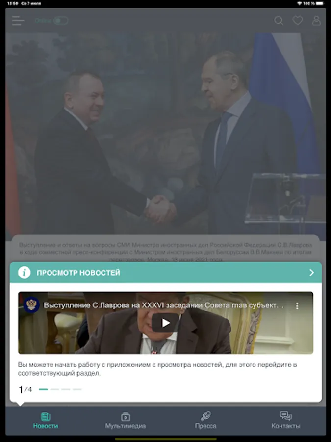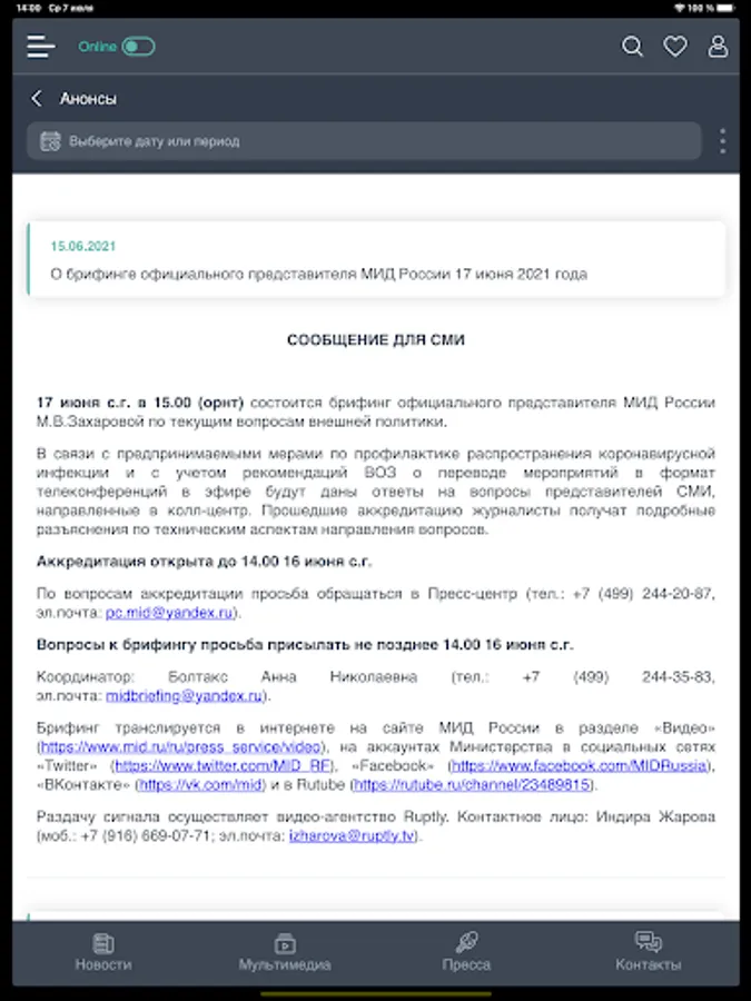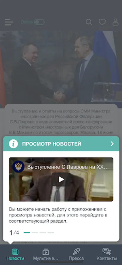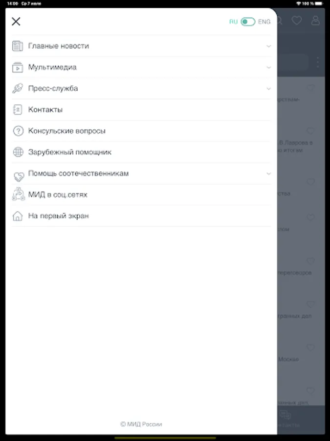 - viewing the news feed and key sections of the official portal of the Russian Foreign Ministry in Russian and English;