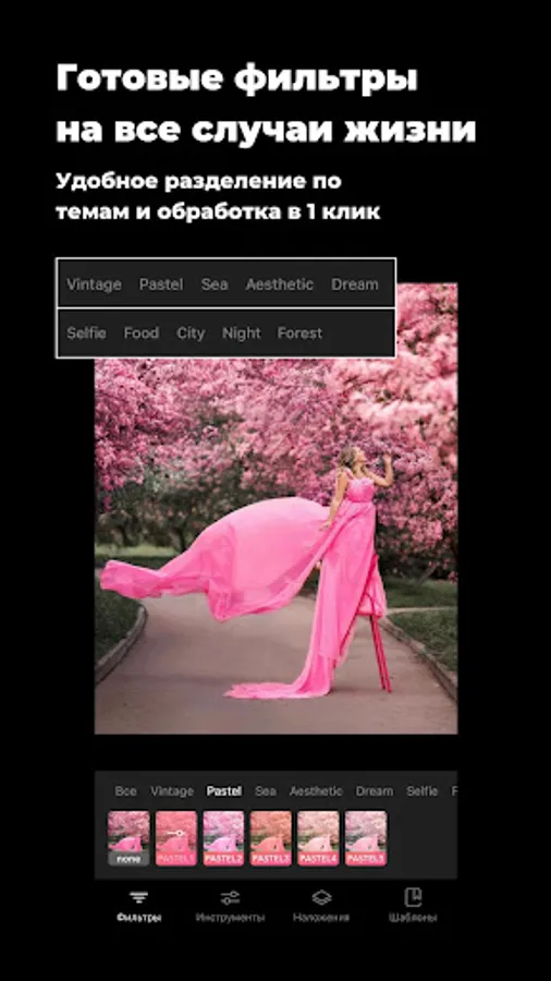 Speed up your photo editing by using one of 50 themed filters (vintage, pastel, selfie, etc.) from MISHMARI PRO Subscription Pack.