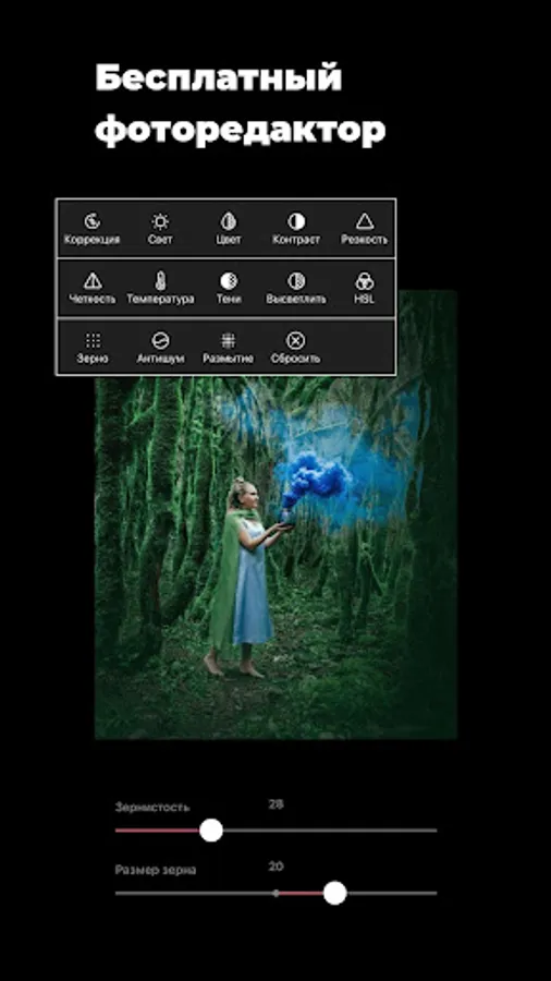 Import and edit your photos. Use editing tools such as Exposure and Saturation to adjust the brightness of your photo, or Clarity and Grain to add texture and mimic analog film effect. Crop your photo to the desired proportions using the Correction tool. Make your photos stand out by customizing each of the primary colors using an advanced HSL tool. Save your favorite seóngs in Templates and apply them to other photos in one tap.