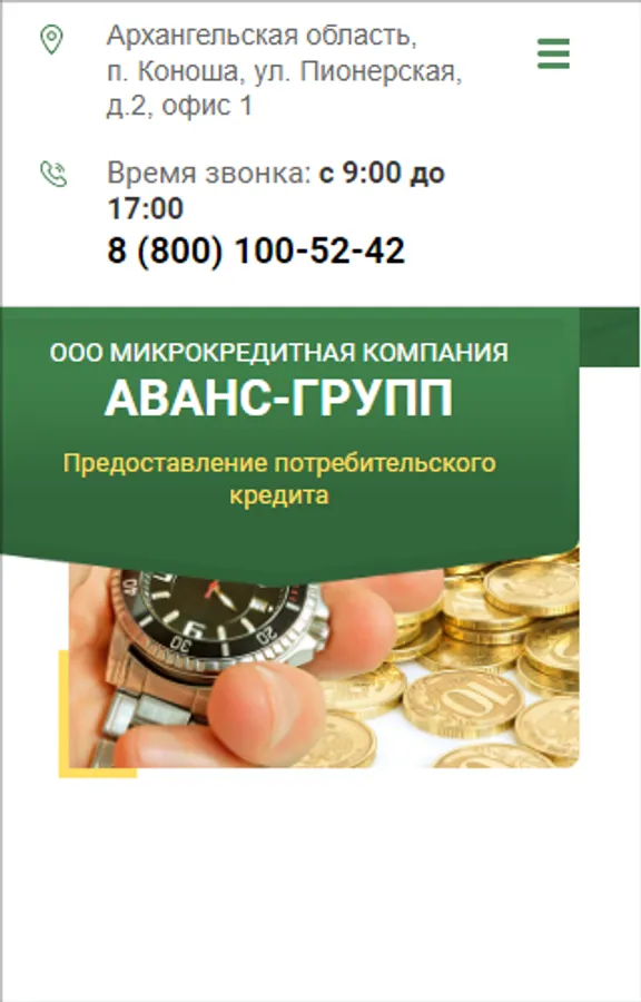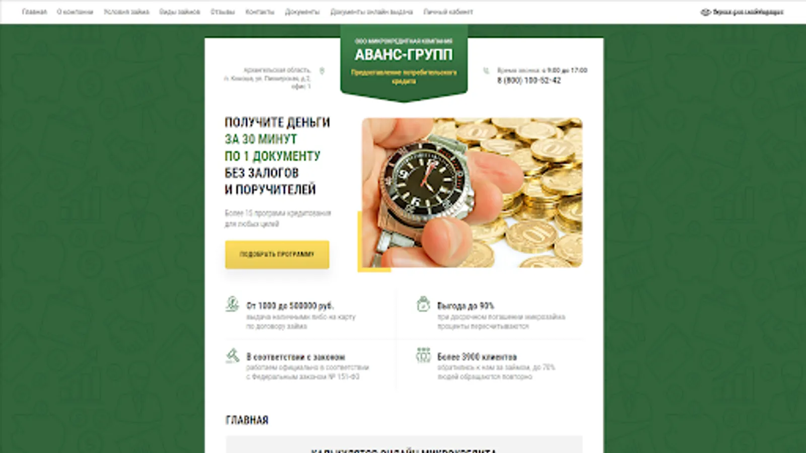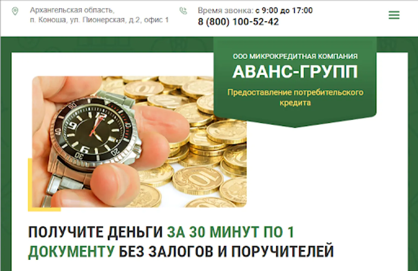 LLC MCC "Avans-Group" specializes in issuing microloans to the population and has been operating in the microloan market of the Russian Federation in accordance with Federal Law No. 151-FZ dated July 02, 2010 ("On microfinance activities and microfinance organizations") since 2014. The main activity of the company is the provision of consumer loans to individuals.