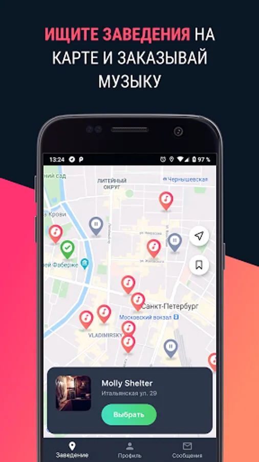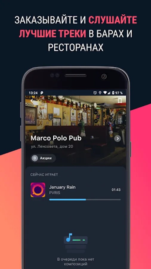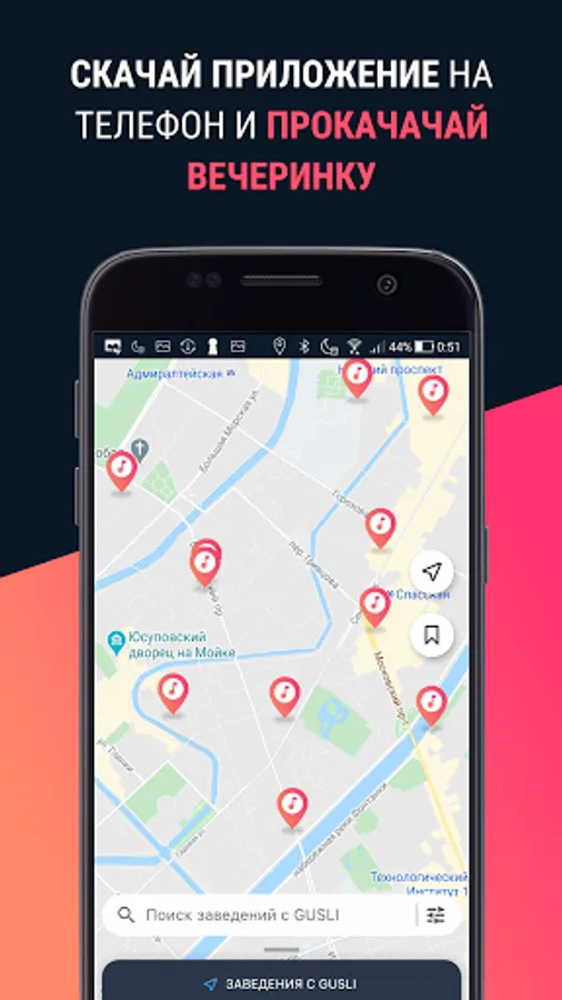 GUSLI is an entertainment service that allows you to play any music in your favorite bars in your city.