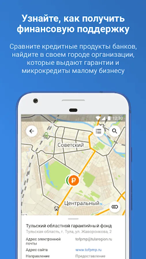 On the map of the city you will find state funds, which issue guarantees and microcredits to small businesses. You will also be able to compare loan rates in different banks-partners of the Corporation and to find a suitable for you.