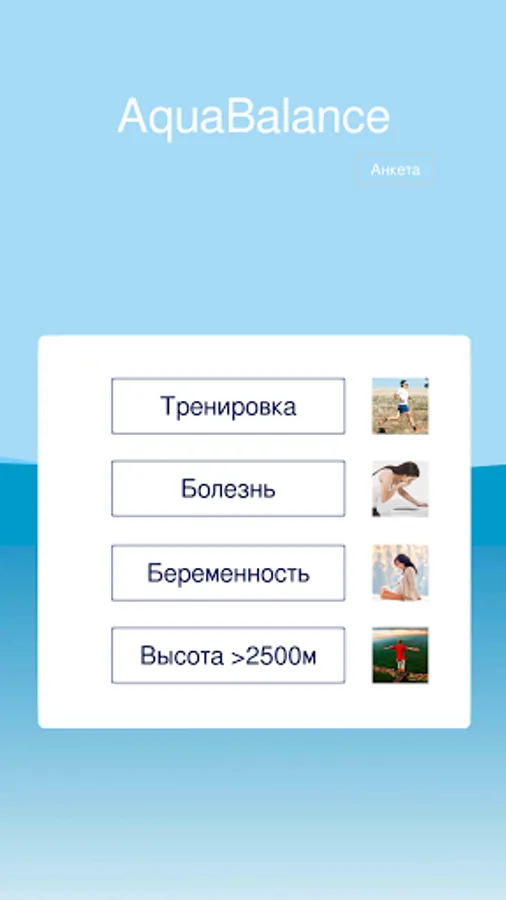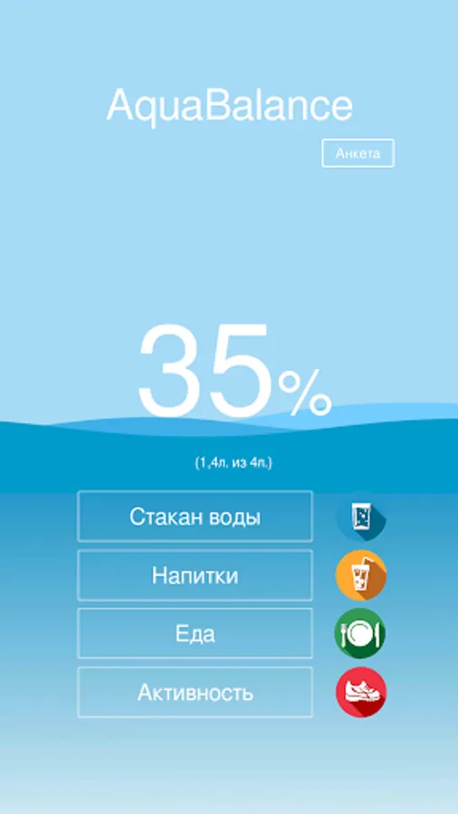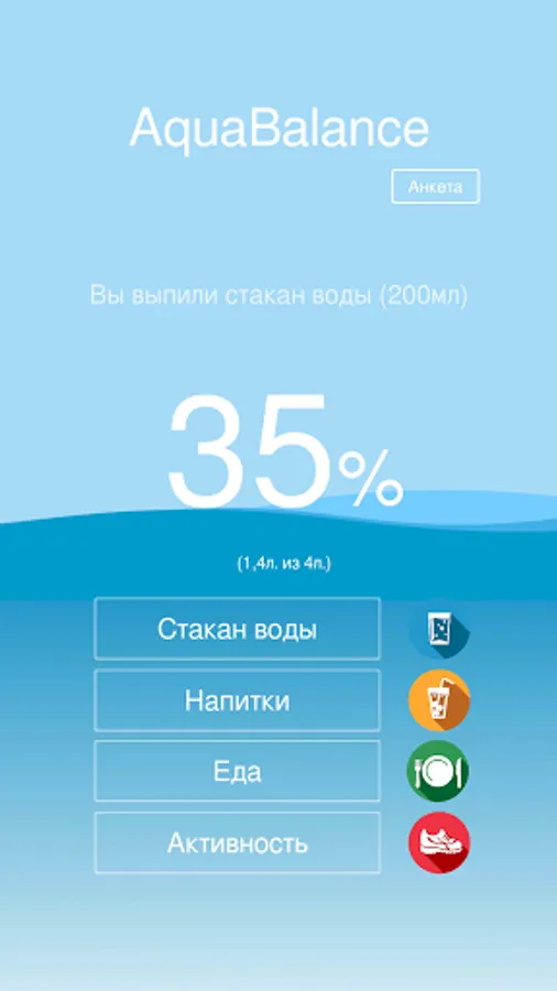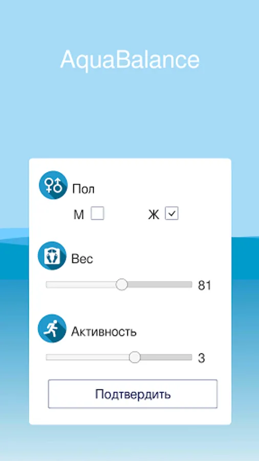 Feeling tired and irritable, anxious and depressed? You may not be sick. You are just thirsty. The human body is about 80% water. The brain contains about 70 - 85% water, muscles - 76%, lungs - 79%. Water is the basis of blood, digestive juices, urine and sweat. Even bones are almost a quarter of water. A person can live without food for several weeks, but without water - only a few days. Water is involved in the regulation of heat exchange, energy synthesis and the removal of waste metabolic products. The human body cannot store water and loses it every day. Up to 200 ml of water leaves the body daily with stools, from 500 to 1500 ml - with urine, up to 400 ml - through breathing, up to 500 ml - through the skin. Water losses and water requirements are influenced by nutrition, respiratory rate, humidity and air temperature, activity level, and metabolic rate. The human body is a symbiosis of water and chemical elements. Therefore, any violation of the water balance can provoke the development of the most serious diseases. Lack of water leads to dehydration, a decrease in blood volume in the body, oxygen starvation, and even shrinking of cells. Having lost only 3% of water, a person can no longer run, the loss of 5% deprives him of the opportunity to train, and the loss of 10% poses a danger to life. That is why for the normal functioning of the body, water reserves must be constantly replenished. How much water do you need to drink during the day? The application will help you know exactly how much water you will need to drink today, taking into account your age, gender, activity, nutrition. Using the application, you will know exactly about the body's needs for water at any hour of the current day.
