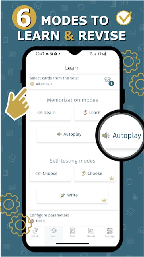 “Autoplay” mode helps you listen to your words, with needed repetition rate settings, while you're driving or jogging.