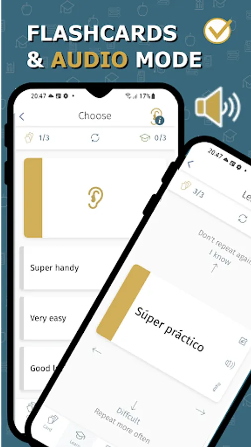 Homework or exam preparation? Tons of new words for a test or a lesson? Our flashcard maker helps you to revise and listen to your words - at home, on transport, while walking, training, or driving!