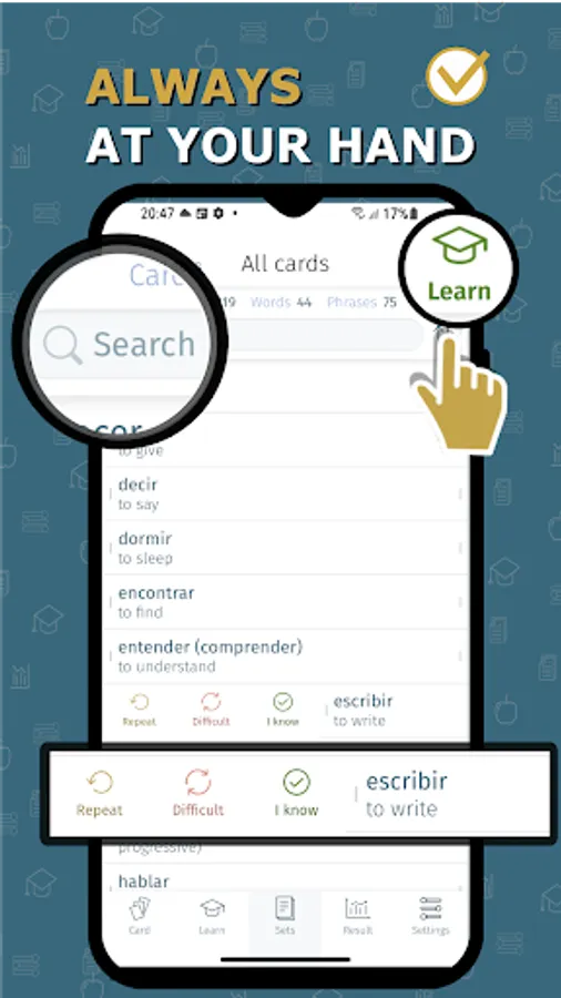 Use memorization and self-test modes with a smart repetition system - study your lexis by using flashcards with pronunciation or with quizzes.