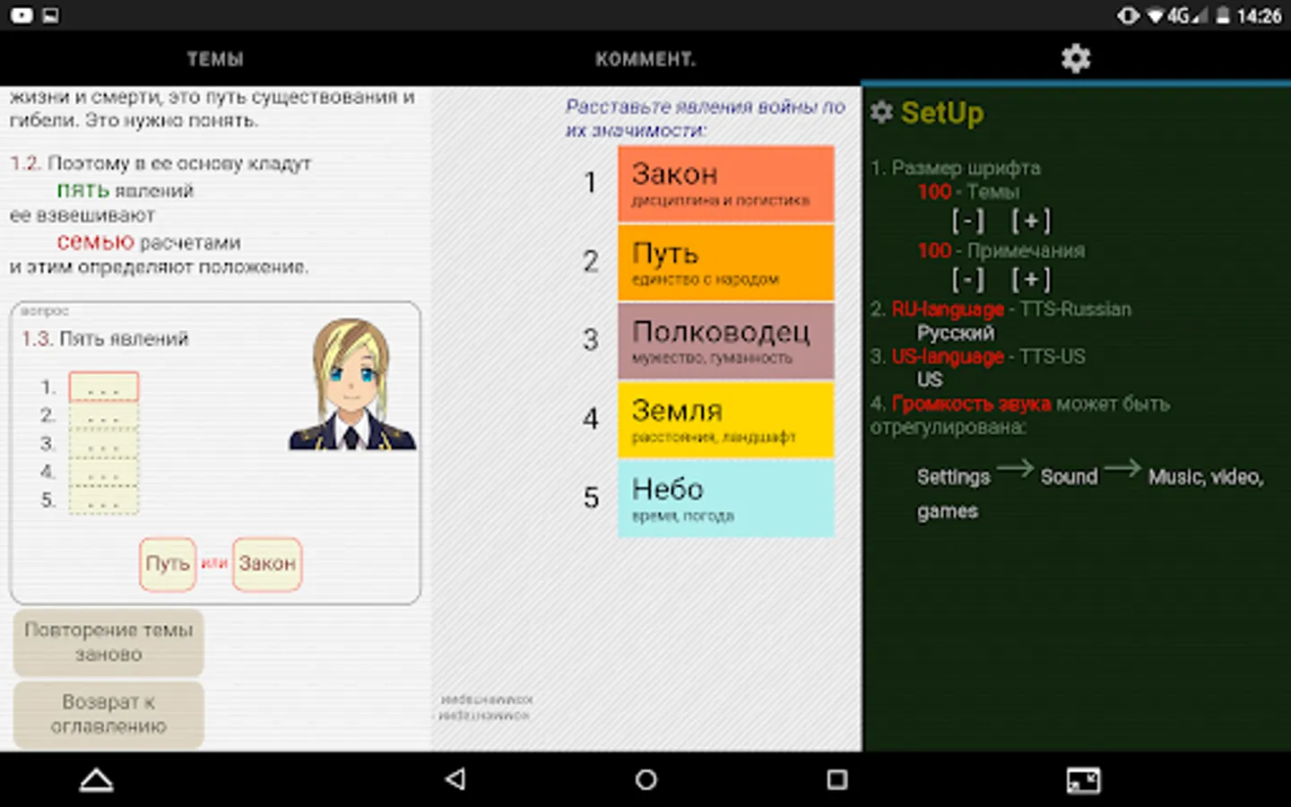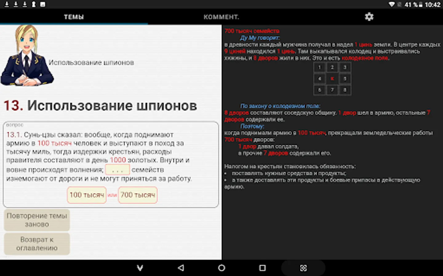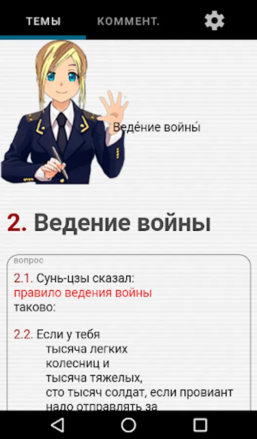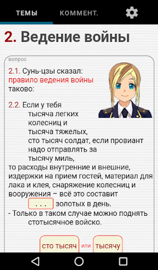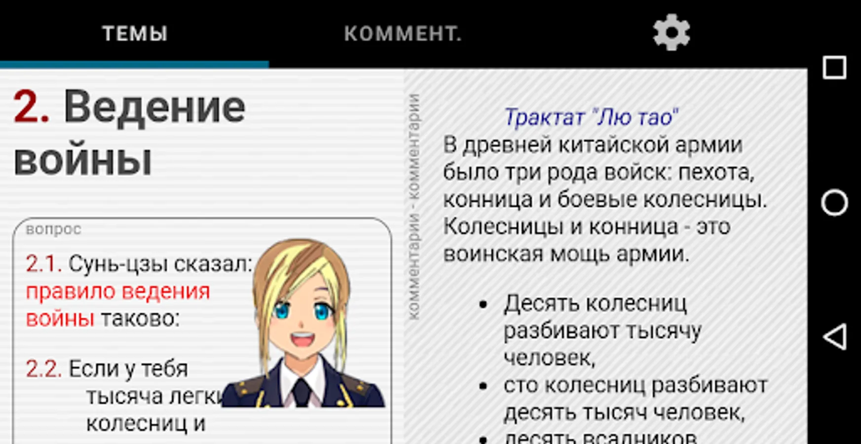 You must answer chains of questions about tactics and strategy, about the use of enemy weaknesses, the practical control of soldiers, about the methods of attacking the enemy, about the use of spies, etc.