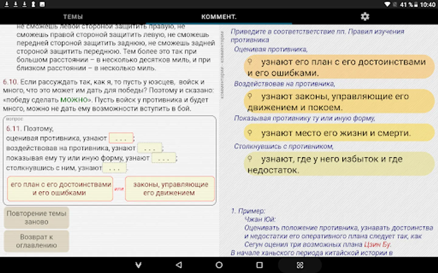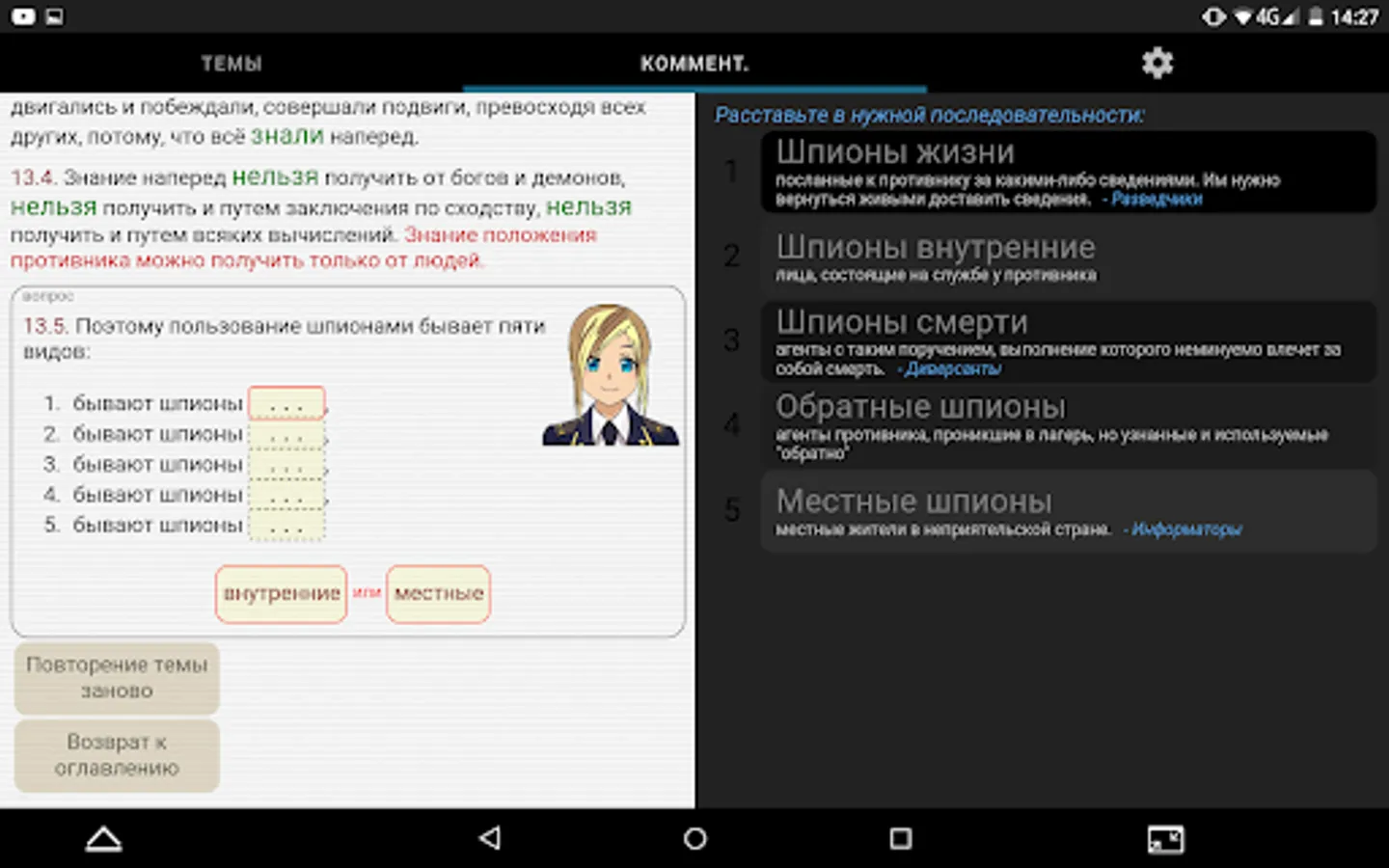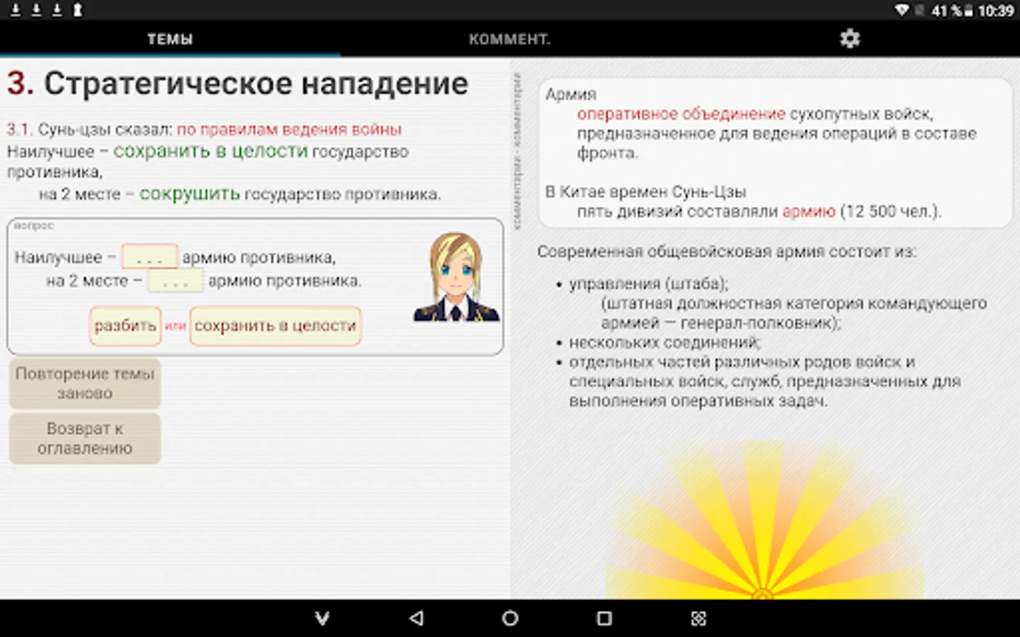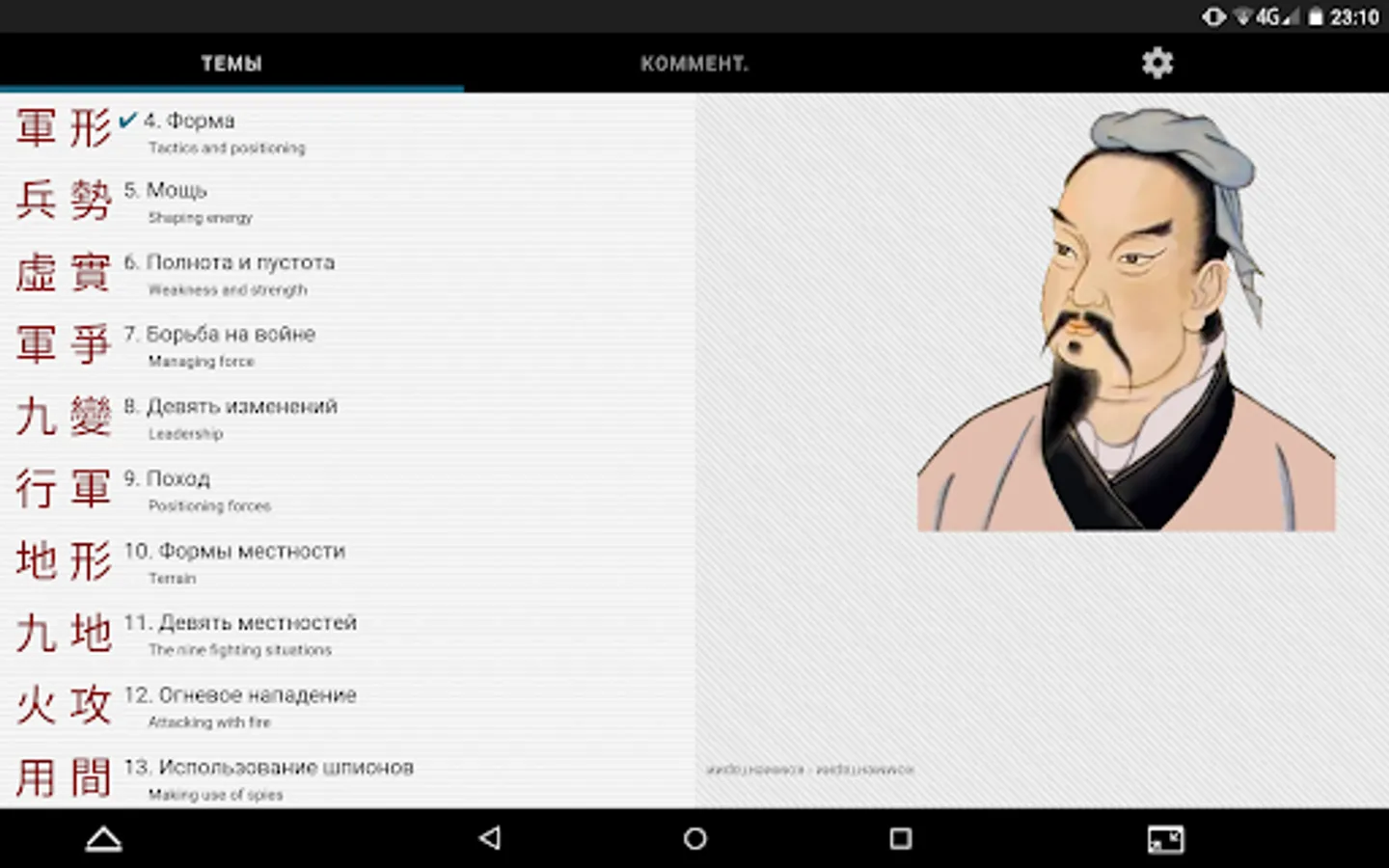 You must answer chains of questions about tactics and strategy, about the use of enemy weaknesses, the practical control of soldiers, about the methods of attacking the enemy, about the use of spies, etc.