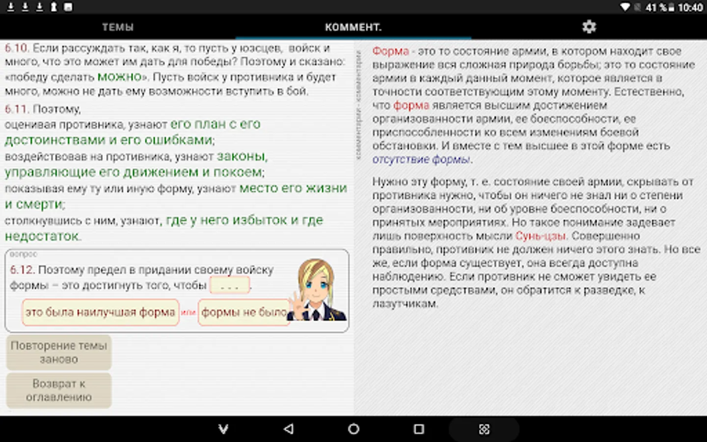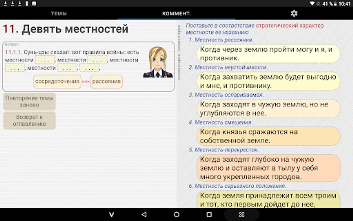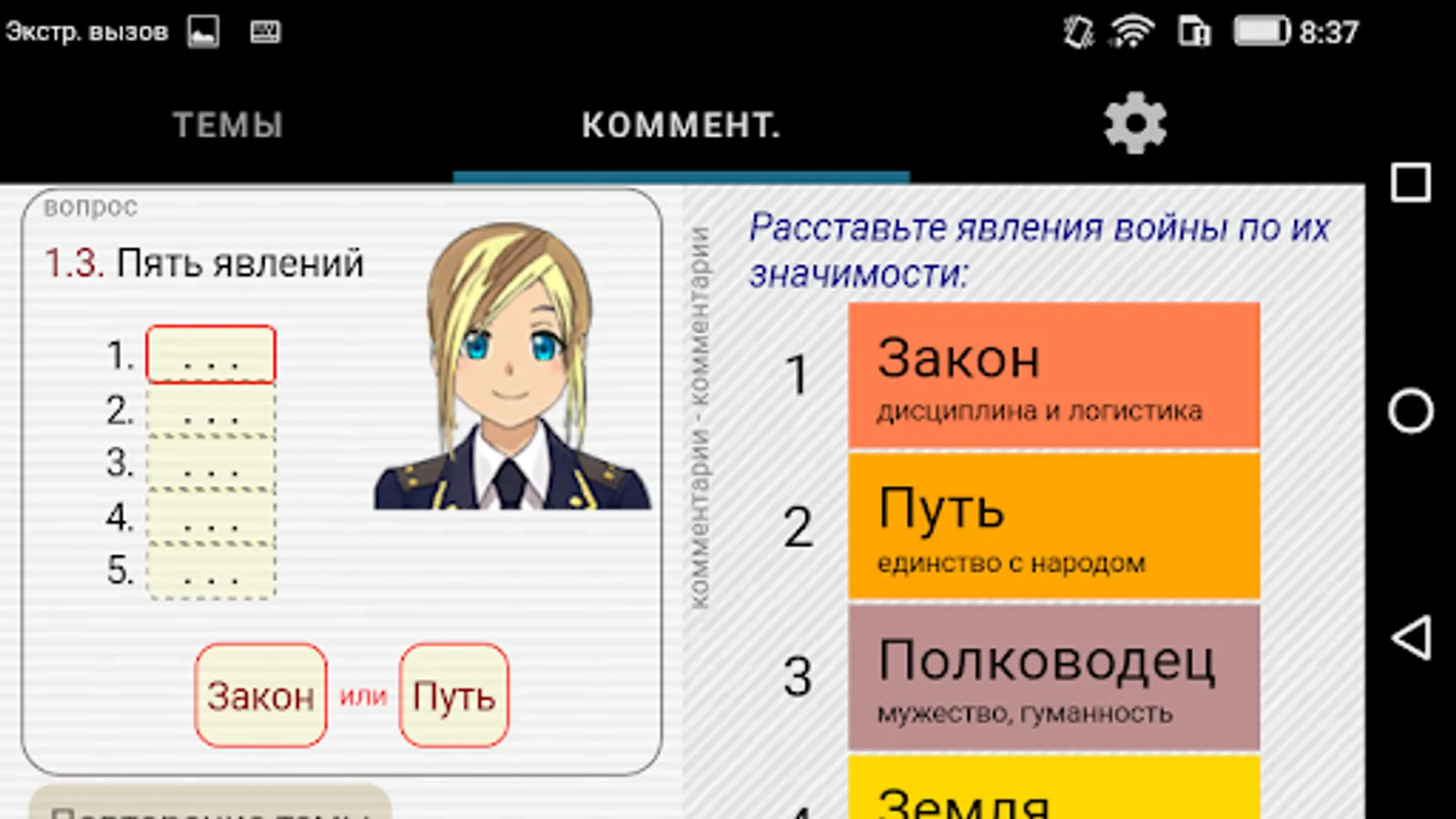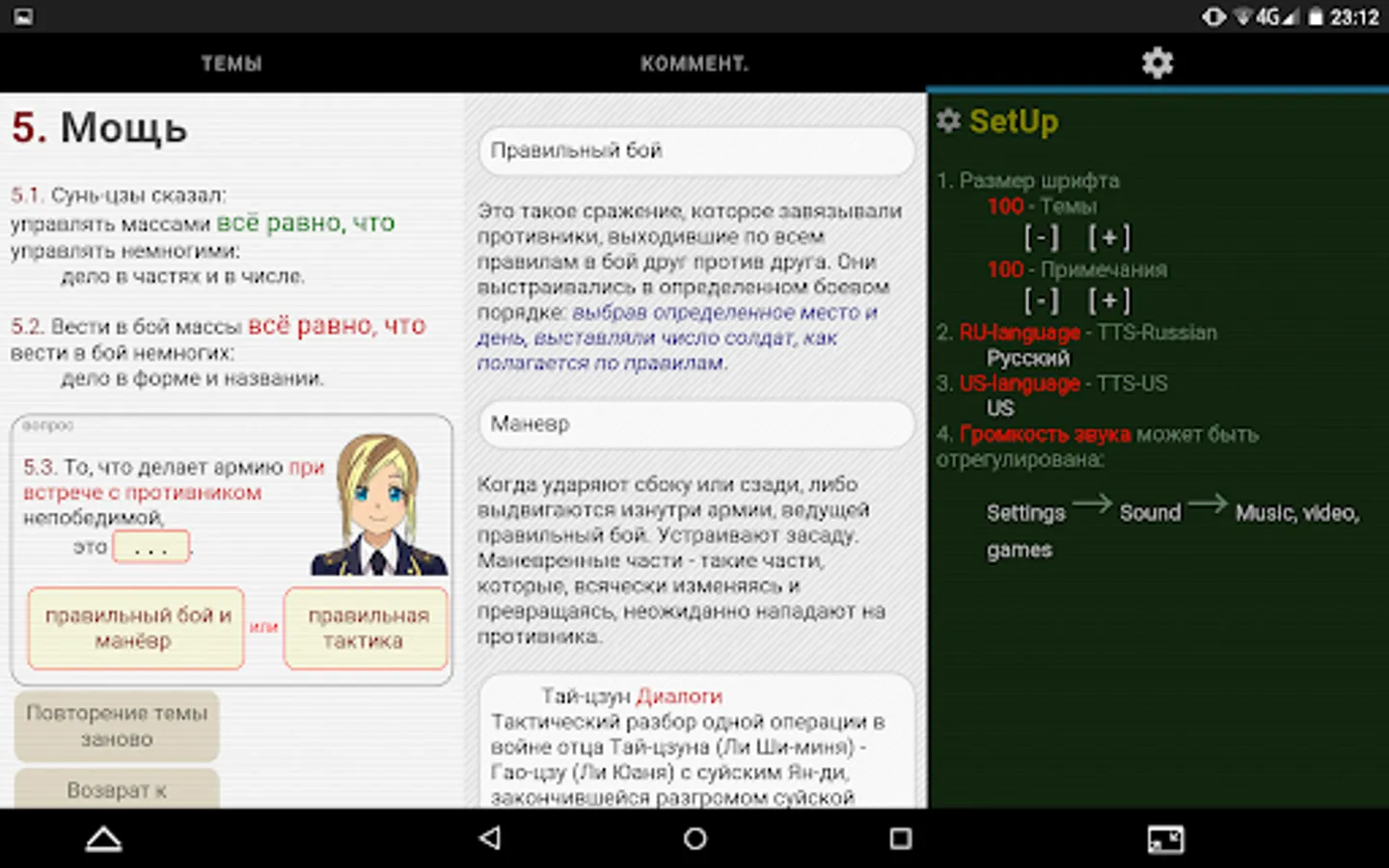 You must answer chains of questions about tactics and strategy, about the use of enemy weaknesses, the practical control of soldiers, about the methods of attacking the enemy, about the use of spies, etc.