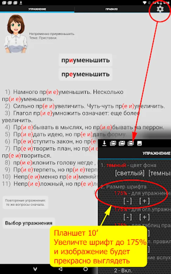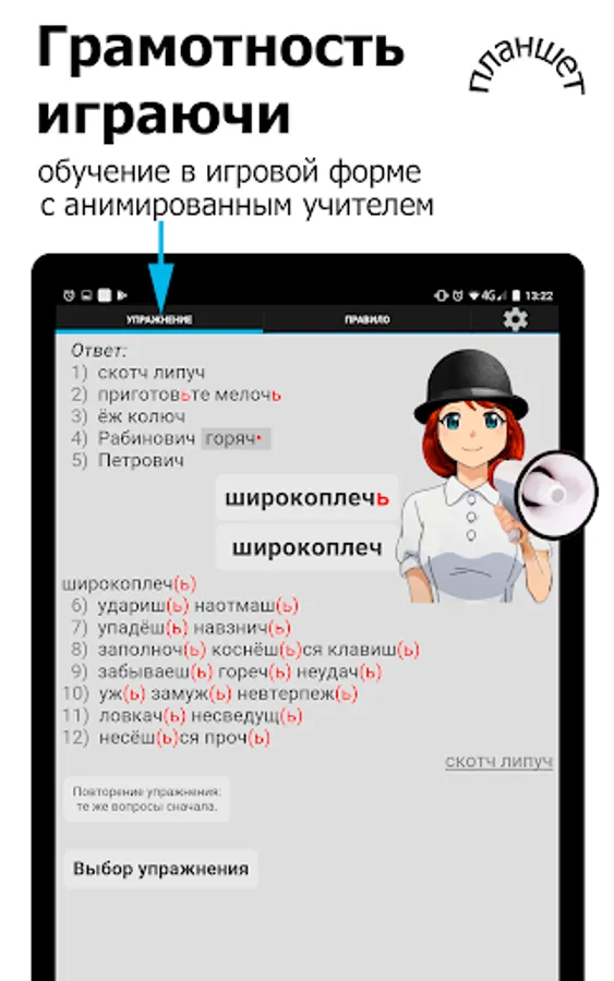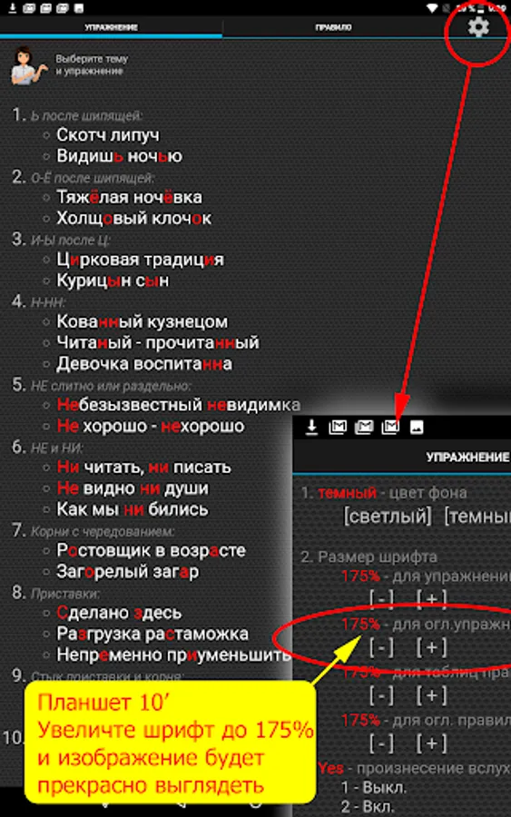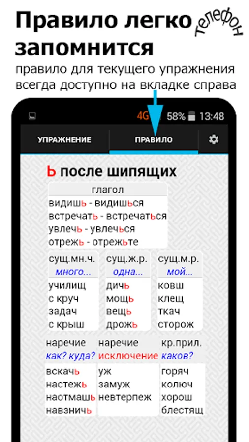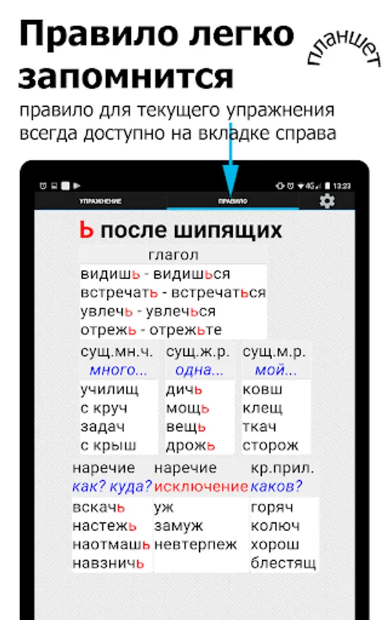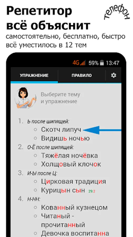 You can quickly and independently master spelling. All exercises are grouped into 12 topics and correspond to the grammar rules, which are located right next to it - in the tables .