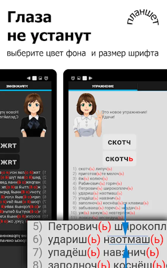 This program is a stripped-down version of another program: Russian language. Exercises , from which redundant information has been removed: Academic handbooks of 1956 and 2007 rules Added animation to the interface: Tutor .