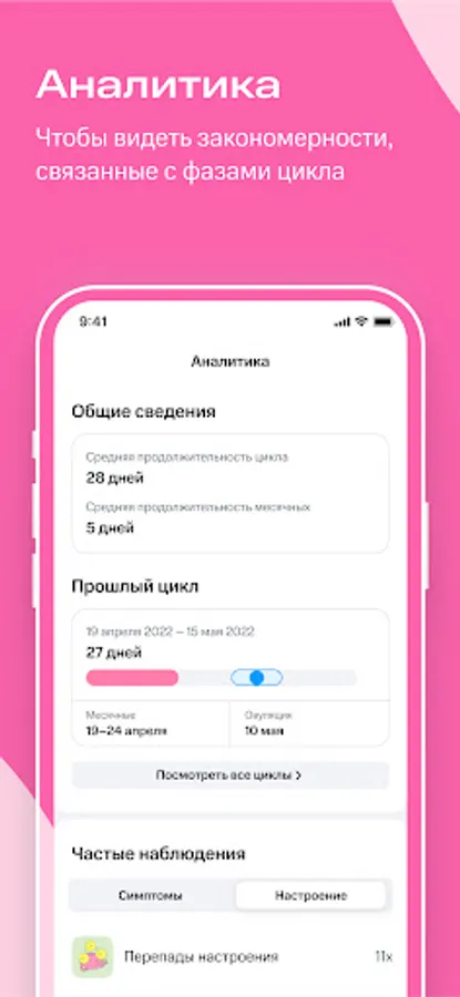The menstrual cycle is an important part of any woman's health. Many processes in the body depend on it: disruptions in the menstrual cycle are symptoms of many diseases. It will be helpful for your doctor to be aware of symptoms, delays, and any problems related to the menstrual cycle in time. Monitor your women's health and get accurate analytics for a doctor absolutely free.