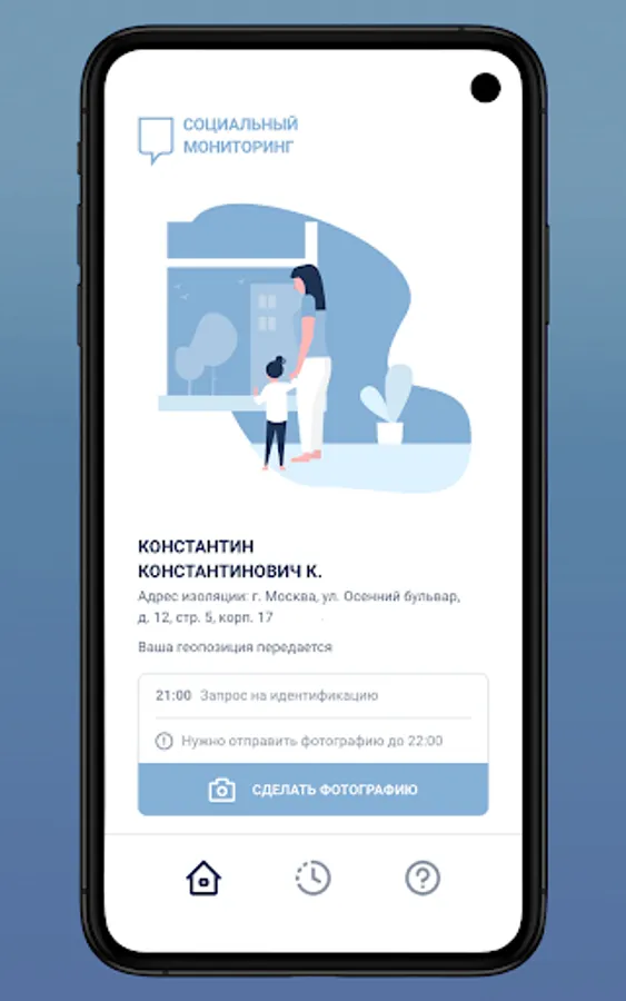 The Social Monitoring application was created for patients with a confirmed diagnosis of COVID-19 and citizens in contact with them, living in Moscow and observing their prescribed isolation regime. With its help, the patient informs the city about the conscientious observance of quarantine.