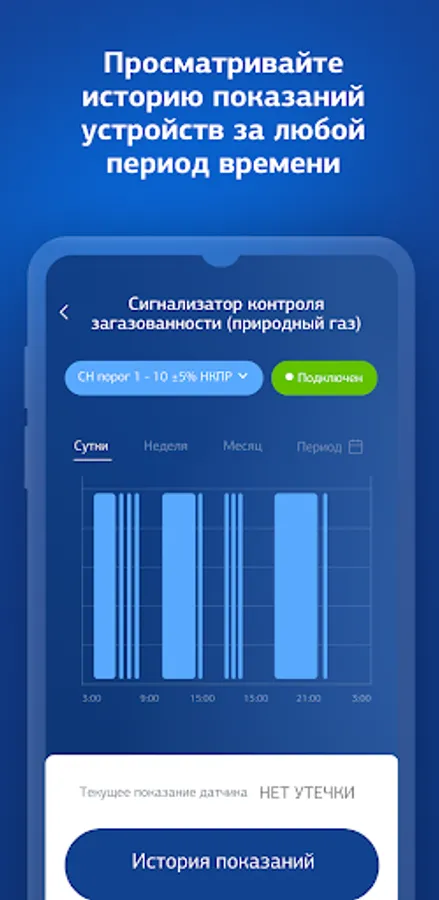 Anywhere in the world you will be aware of the level of gas contamination (in the event of an emergency, a push notification is sent to the application or an email). You can also see the statistics of readings for the period of time you are interested in.