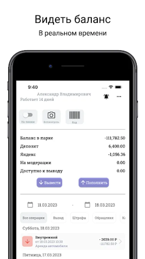 Driver's personal account, balance information, balance management, replenishment, withdrawal, information on traffic fines, deposit status.