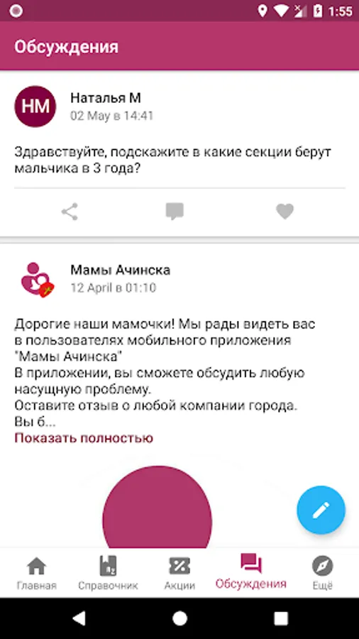 Moms Cities is an informational mobile application that allows you to quickly get answers from other moms to all interesting and important questions, save on products and services for yourself and your child thanks to the "Promotions" section, study the most useful articles for women in the news, always have on hand a directory of organizations with an interactive map and built-in ratings and reviews.
