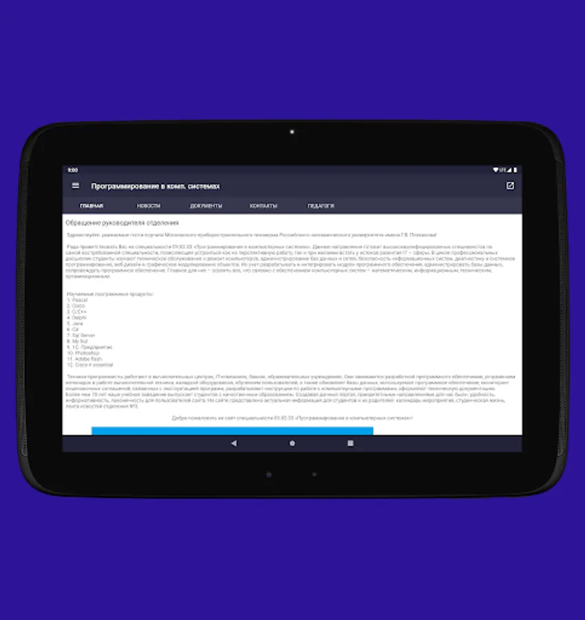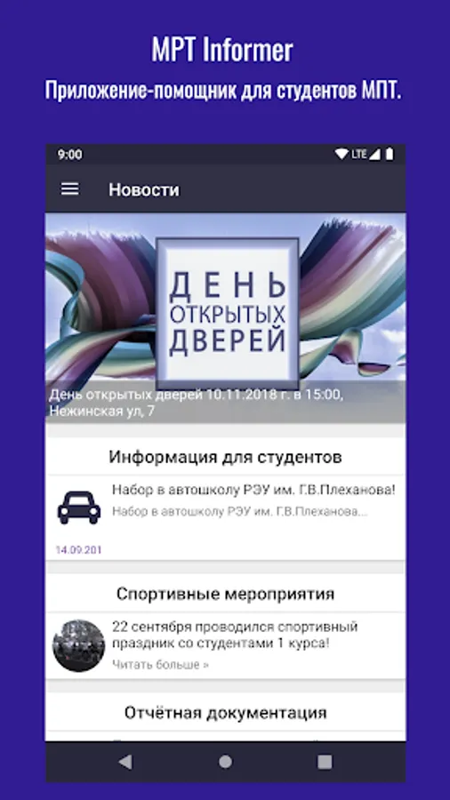 This application allows students, applicants and parents of students to receive the most important and relevant information about the educational institution "Plekhanov Russian Economic University named after GV Plekhanov Moscow Instrument Engineering College".