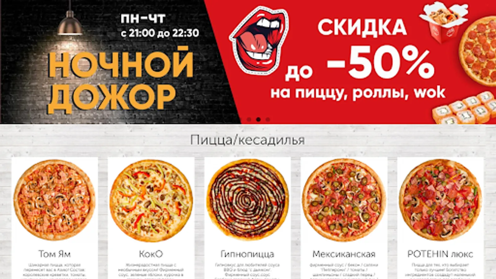 In the Potehin food app, you can always order pizza, rolls, sushi, salads, soups and much more. The application is always up-to-date promotions and discounts!