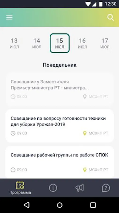 The events of the Ministry of Agriculture and Social Affairs of the Republic of Tajikistan are an application that allows you to track the upcoming and past events of the Ministry of Agriculture and Food of the Republic of Tatarstan, as well as: