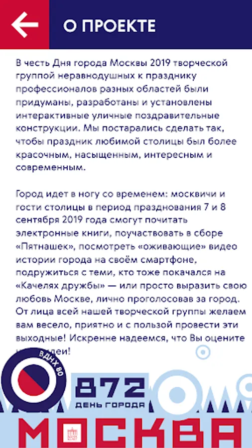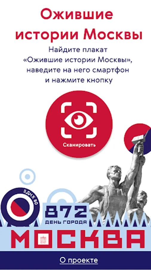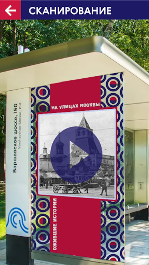The mobile application for street interactive posters “Living History of Moscow 2019” as part of the celebration of Moscow City Day 2019. Posters with photos are placed at public transport stops. In this application, photographs printed on posters come to life using augmented reality technology: instead of a static image, the user views a video with the corresponding history of the city of Moscow through a smartphone’s camera.