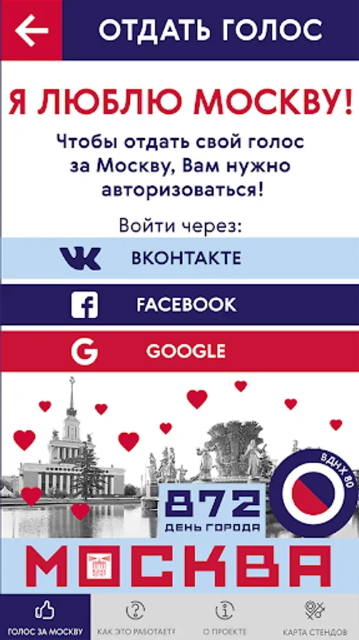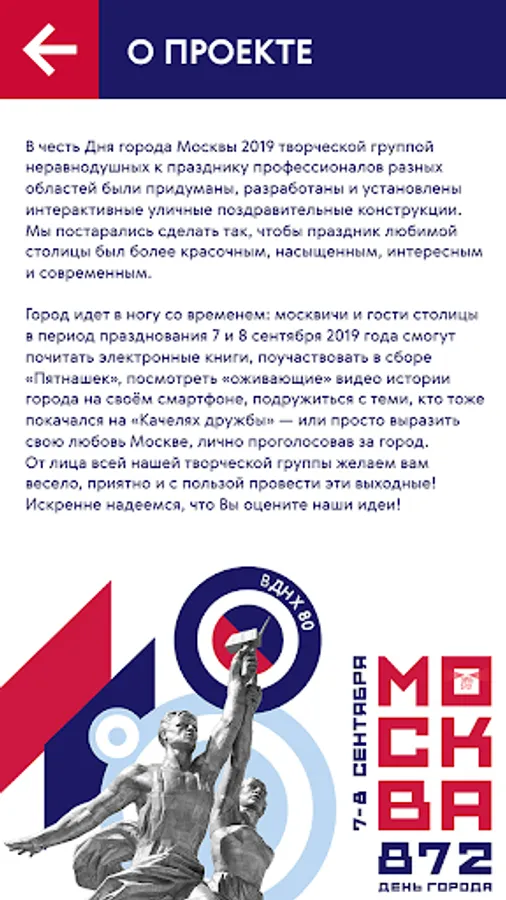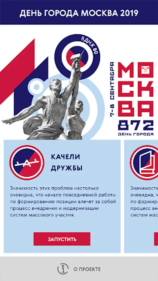 In honor of the Day of the City of Moscow 2019, interactive street cognitive and entertainment structures were developed and installed. With their help, during the celebration of September 7 and 8, 2019, you can read e-books, participate in the collection of “photo spots”, make friends with those who swayed on the “Swing of Friendship” - or simply express your love to Moscow by personally voting for the city . Find the street structure, select it in this application - and take part in the city interactive! The list and addresses of street structures can be found in this application after installing it.