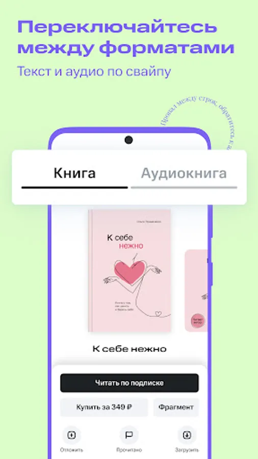 • The e-book and audiobook are linked together in one card. Choose by swipe what you want today - listen or read.