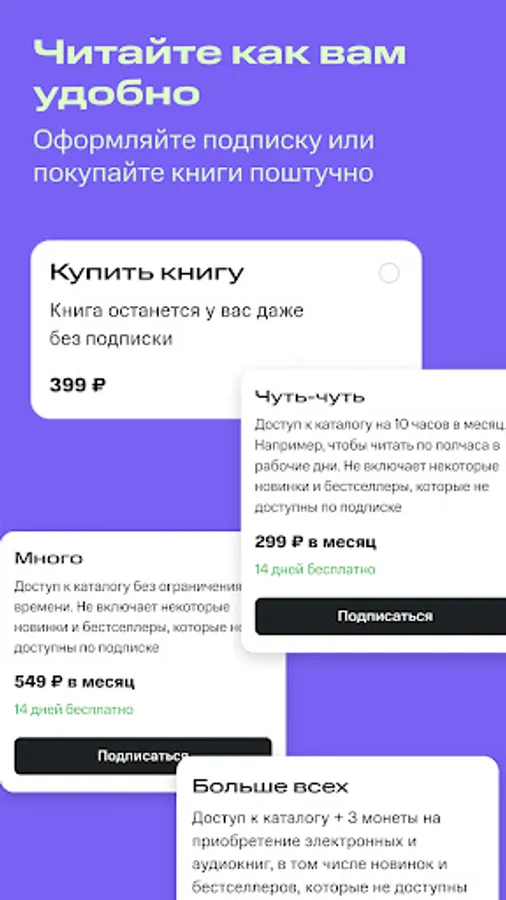 "A little bit" - Access to the catalog of works, except for new products, for 10 hours a month. For those who read a little on the way to work or before bed.
