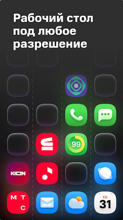 Customizable desktopMove, delete and change your main desktop. Change application icons, set icons in the form of a rhombus, square, drop. Adjust the screen grid to suit your eyes.