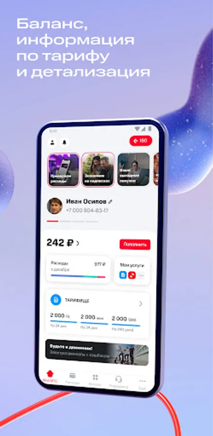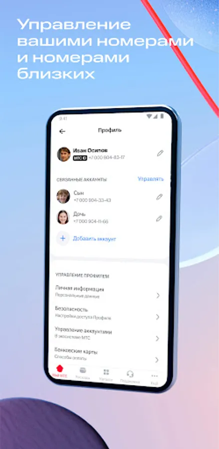 Add your mobile numbers, smart devices, home internet and TV, and the numbers of your loved ones - so you will have quick access to all information about them. And switching between accounts is easy - on the main screen with the usual swipe.