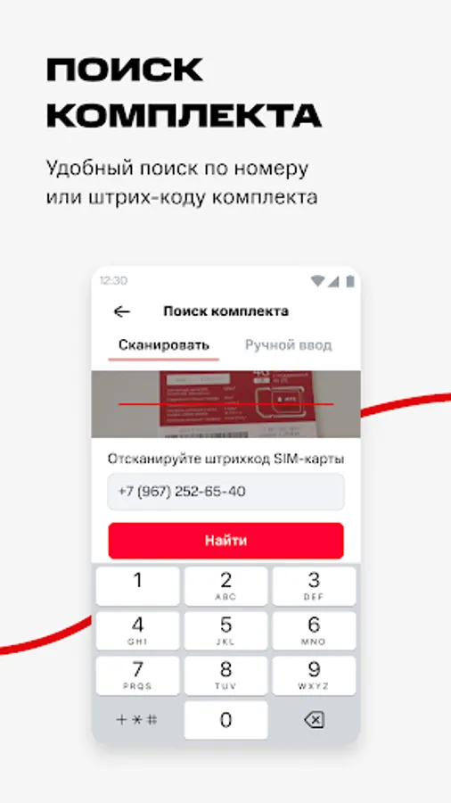 Speeding up the sale of SIM-cards is also achieved by quickly scanning the barcode of the kit (No. ICCID), while using the built-in camera of a smartphone.