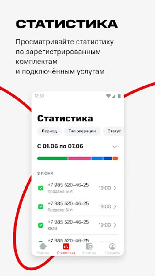 The application allows Sales Representatives to view personal general statistics on registered SIM cards.