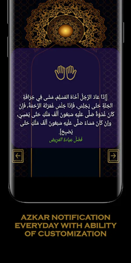 • Azkar of the day, showing Azkar notification everyday with ability to customize and chose the Azkar of day notification time from settings.