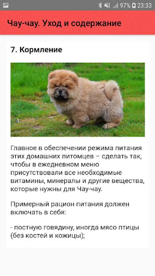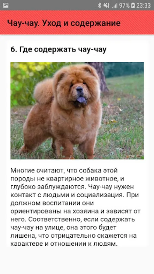 Chow-chow adapt well both in the house and in the apartment. The only condition of detention is that they must be indoors with people, not in the backyard or in the nursery. They do not tolerate heat, so you should take care that they are cool. As for the berth, then a large couch is well suited for this. Like any dog, an adult Chow Chow needs daily training to stay healthy and happy. The contents of the Chow Chow in a city apartment is not difficult, as this dog is very calm, balanced, with a strong psyche, is not inclined to howl alone and spoil furniture and, which makes it especially pleasant to maintain, is incredibly clean.