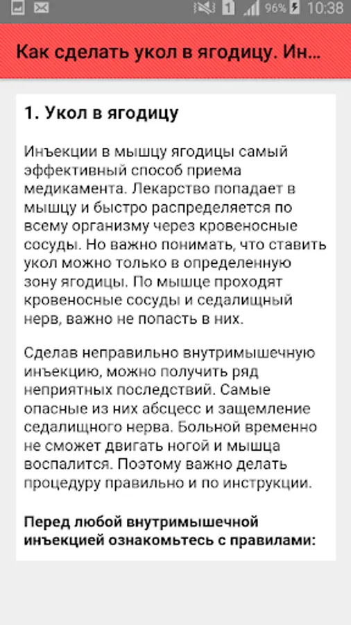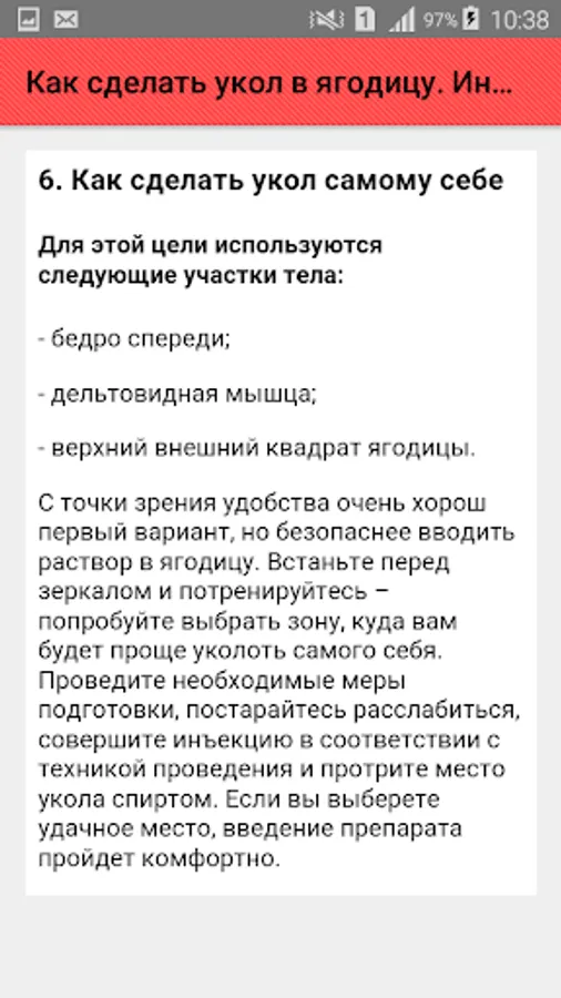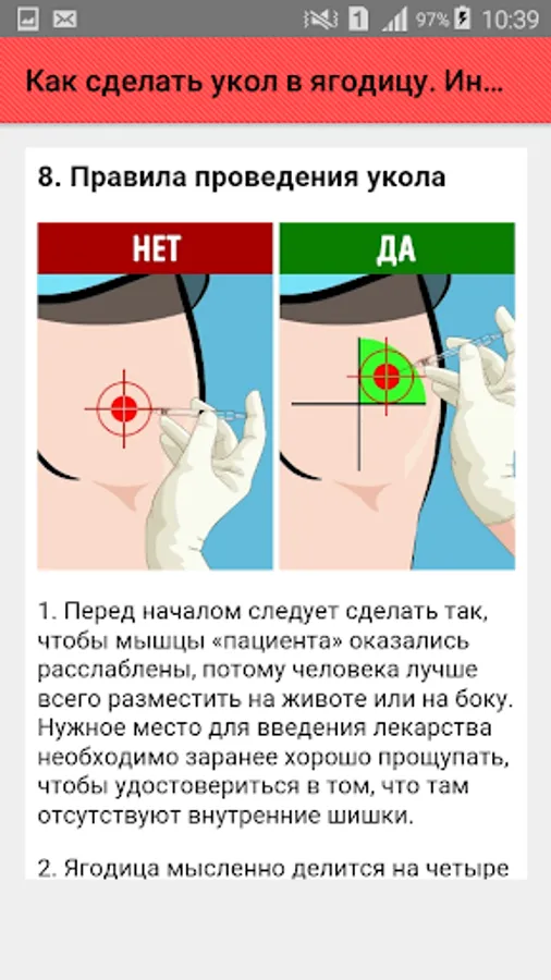 Make a shot in the buttock is easy. The main thing is to follow the sequence of actions and know all the nuances of the procedure. Technique for injection to adult. The following scheme will help to put a shot as painlessly as possible. Lay the patient face down on a flat surface and release the upper part of the buttock from the clothes. Wipe the injection site with a cotton swab dipped in alcohol. You need to hold the syringe with your right hand, and with your left to tighten the skin in the zone of the upcoming injection. The needle should be inserted into the muscle by three quarters at a 90 degree angle.