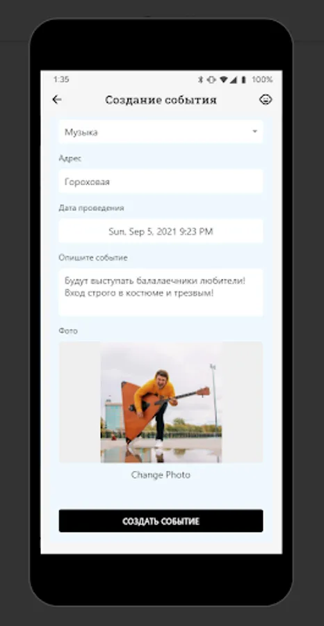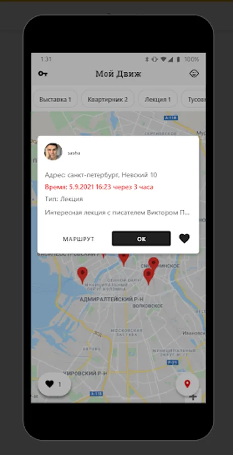 An interactive map of the city, with the ability for each registered user to post free information about the upcoming event: the type of event, the address of the event, the time of the event, a description of the event and the ability to attach a photo / poster. The event is automatically deleted 4 hours after it started.