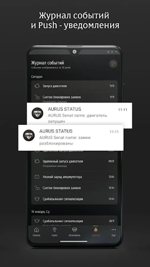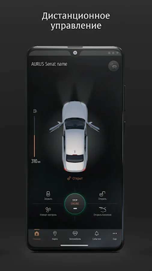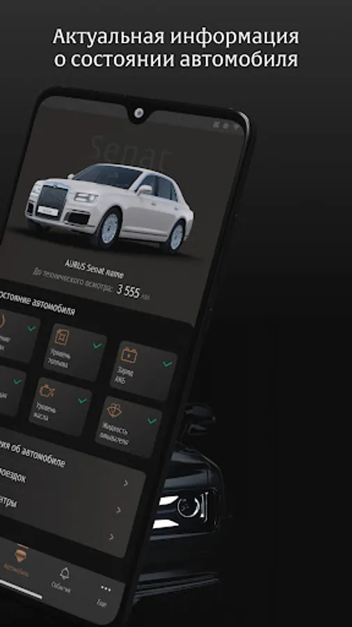 The application allows the owner to remotely control individual functions of an AURUS® car, as well as receive real-time information of interest about its current condition. The application notifies the owner of important events, allows you to view history, provides convenient communication with service centers and a number of other convenient features that make communication with an AURUS® brand car simple and convenient.