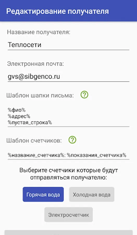 You can create as many "Recipients" as you want (Vodokanal, Heating Networks, Energosbyt, etc.) and send, only those readings of "Counters" that are intended only for them.