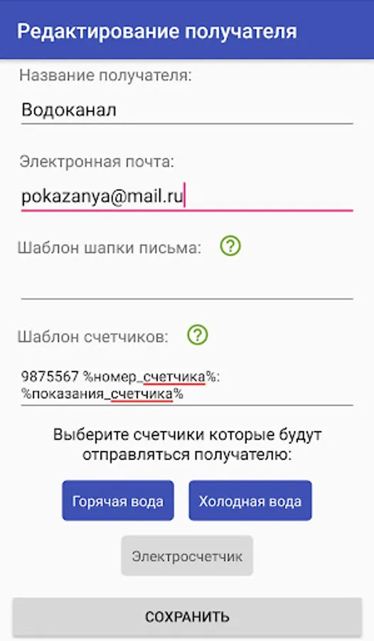 It is also recommended to carefully fill in the "E-mail" field when creating the "Recipient", and make sure that the readings reach the "Recipient". If you specify an incorrect address, the letter will not reach the addressee.